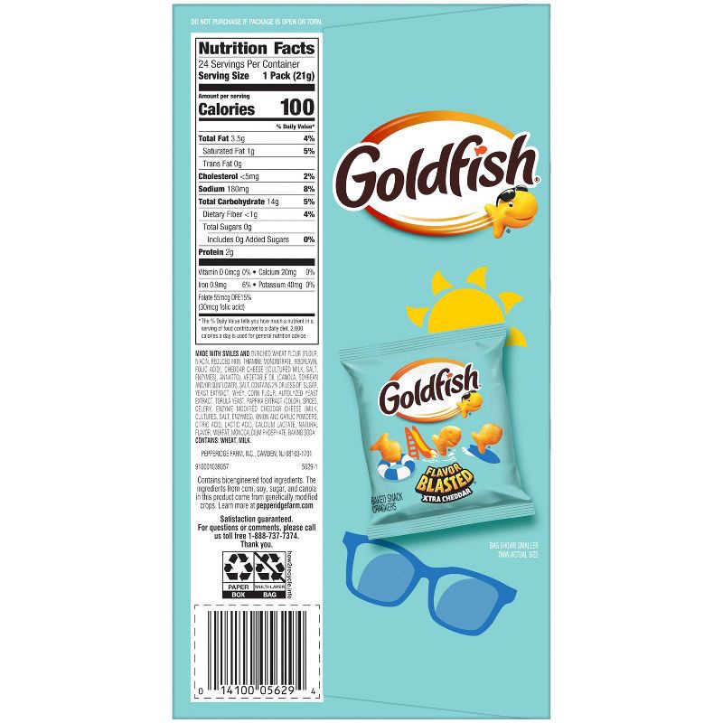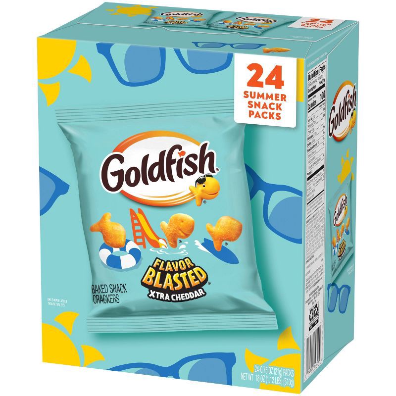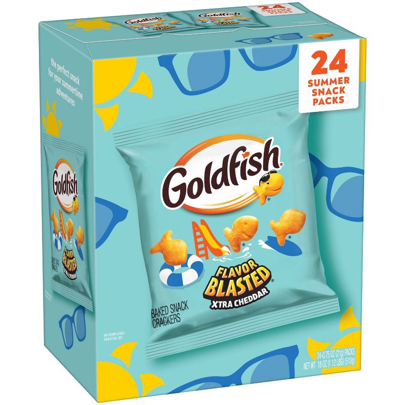 - Includes one (1) box of 24 Goldfish Flavor Blasted Xtra Cheddar 0.75-ounce summer snack packs