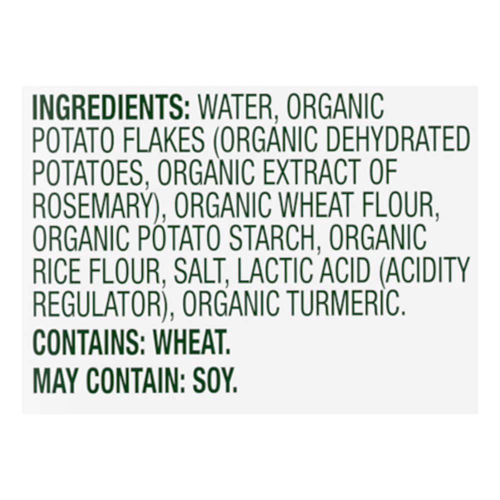 Water, Organic Potato Flakes (Organic Dehydrated Potatoes, Organic Extract of Rosemary), Organic Wheat Flour, Organic Potato Starch, Organic Rice Flour, Salt, Lactic Acid (Acidity Regulator), Organic …