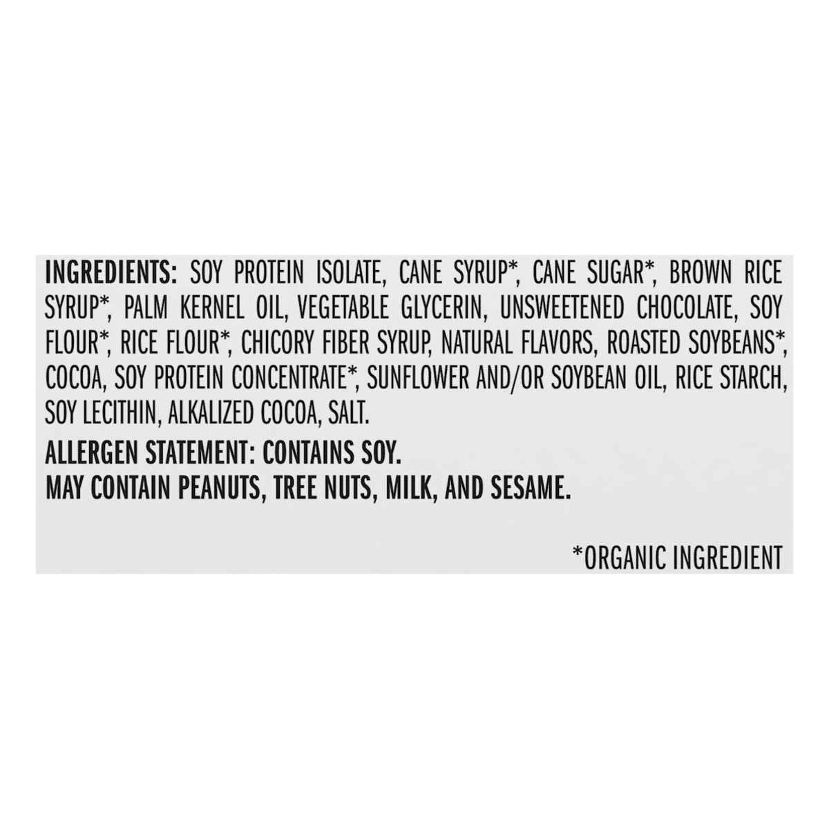 Soy Protein Isolate, Cane Syrup (Organic Ingredient), Cane Sugar (Organic Ingredient), Brown Rice Syrup (Organic Ingredient), Palm Kernel Oil, Vegetable Glycerin, Unsweetened Chocolate, Soy Flour (Org…