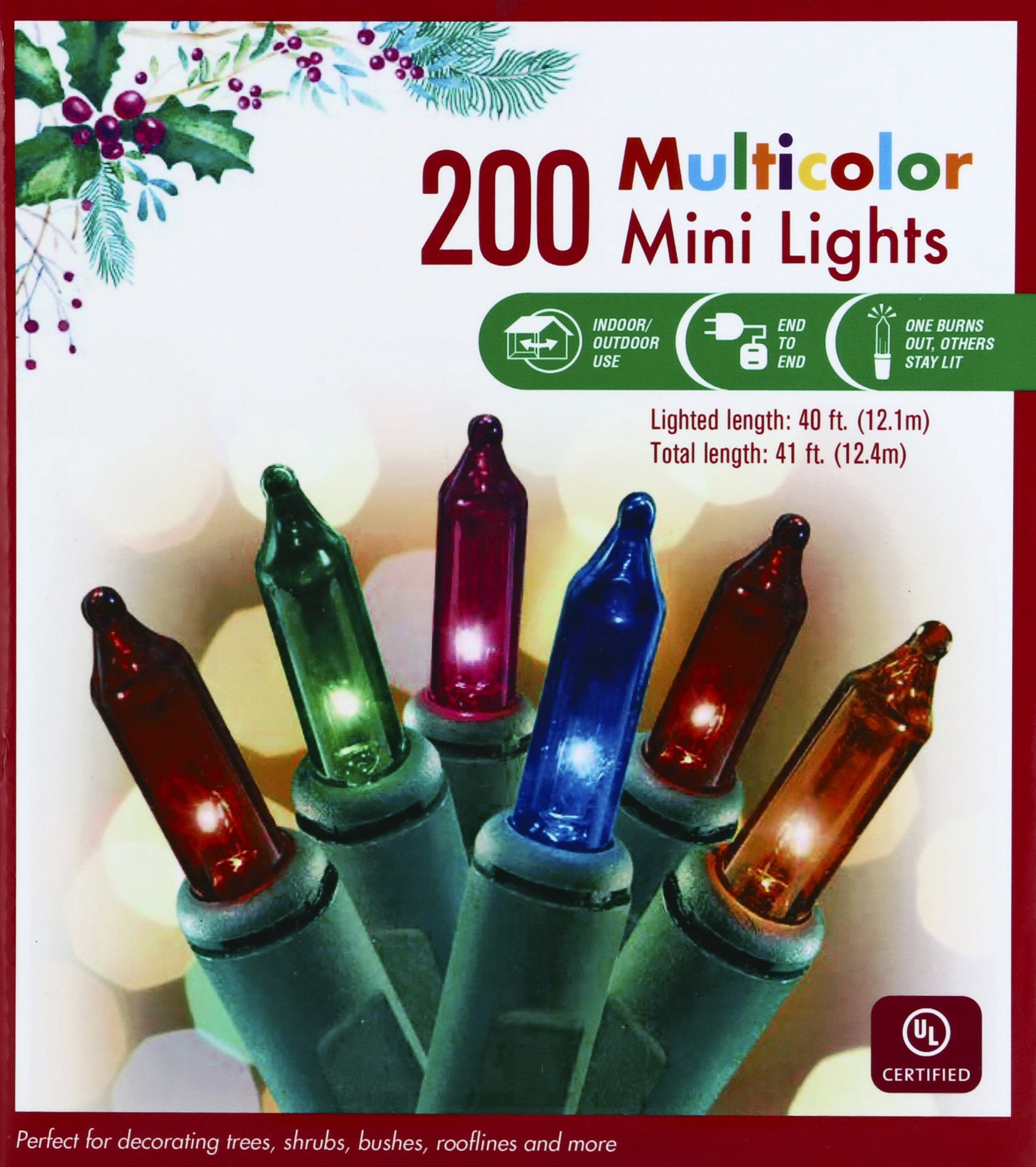 Lighted Length: 40 ft. (12.1 m). Total Length: 41 ft. (12.4 m). Indoor/outdoor use. End to end. One burns out. Other stay lit. perfect for decorating trees, shrubs, bushes, rooflines and more. UL cert…