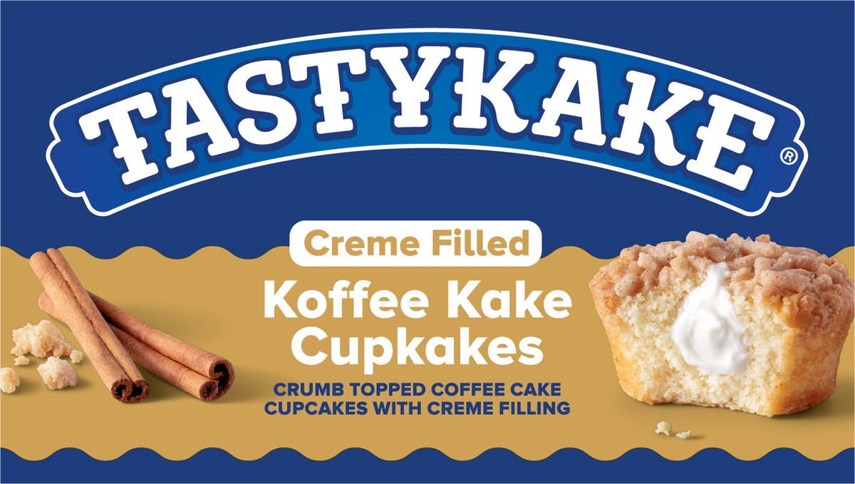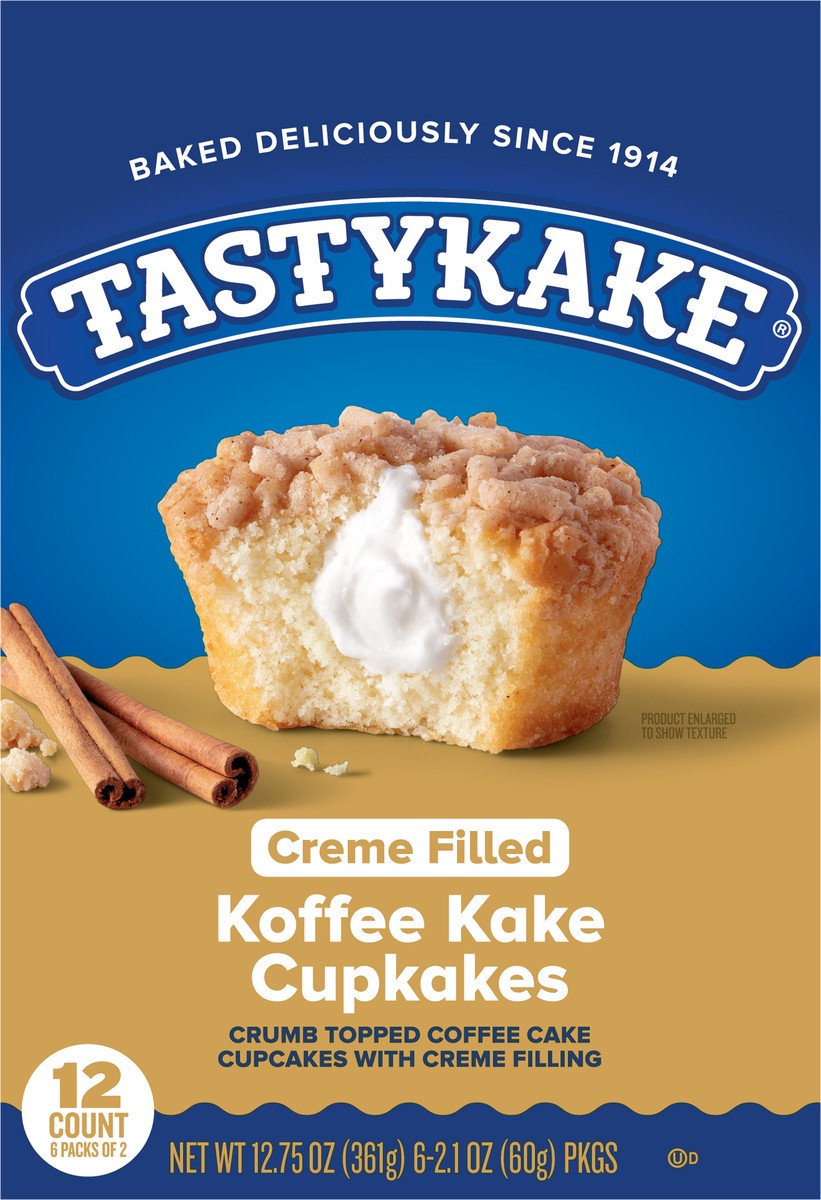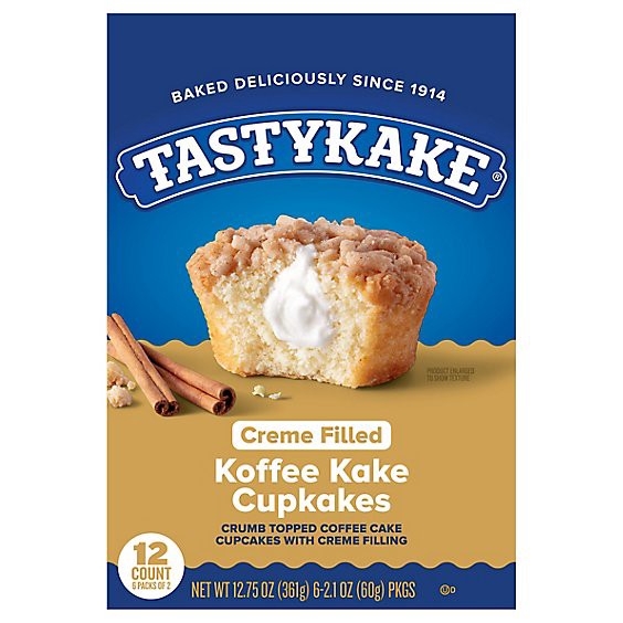 Indulge in a deeply satisfying creme-filled yellow cake cupcake topped with just the right amount of crumb topping. Tastykake Koffee Kake Cupcakes are a delicious on-the-go lunch option or snack anyti…