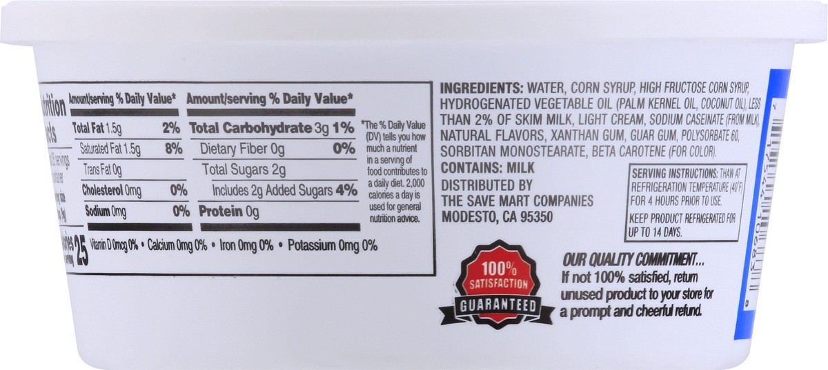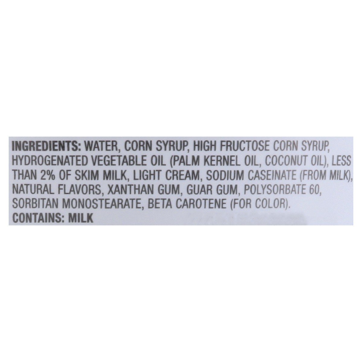 Water, Corn Syrup, High Fructose Corn Syrup, Hydrogenated Vegetable Oil (Palm Kernel Oil, Coconut Oil), Less than 2% of Skim Milk, Light Cream, Sodium Caseinate (from Milk), Natural Flavors, Xanthan G…