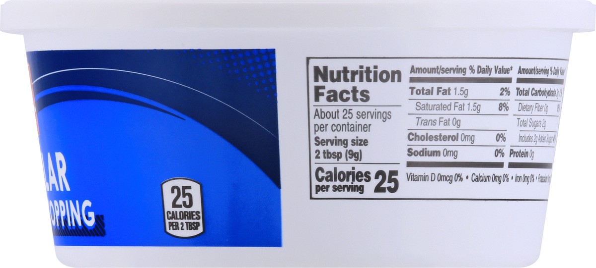 25 calories per 2 tbsp. 100% satisfaction guaranteed. Our quality commitment - if not 100% satisfied, return unused product to your store for a prompt and cheerful refund.
