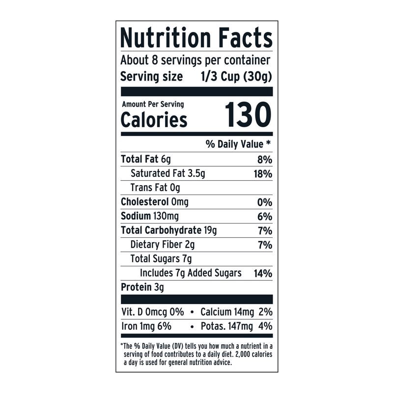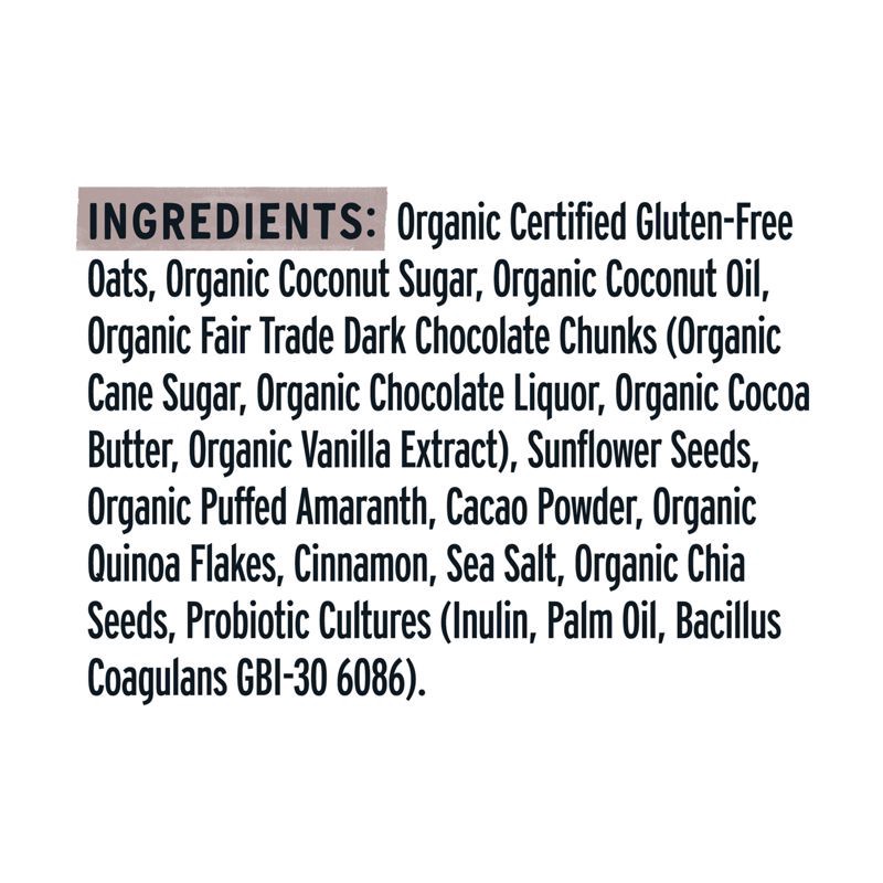 Organic Certified Gluten-Free Oats, Organic Coconut Sugar, Organic Coconut Oil, Organic fair trade Dark Chocolate Chunks (Organic Cane Sugar, Organic Chocolate Liquor, Organic Cocoa Butter, Organic Va…