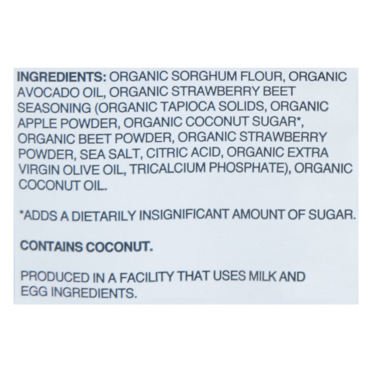 Organic Sorghum Flour, Organic Avocado Oil, Organic Strawberry Beet Seasoning (Organic Tapioca Solids, Organic Apple Powder, Organic Coconut Sugar*, Organic Beet Powder, Organic Strawberry Powder, Sea…