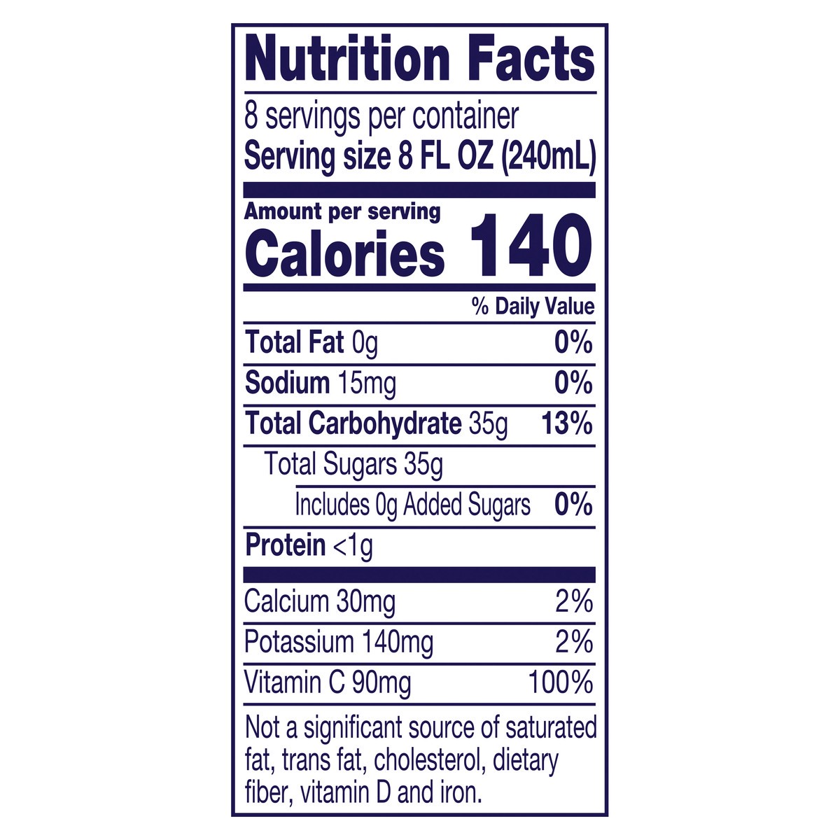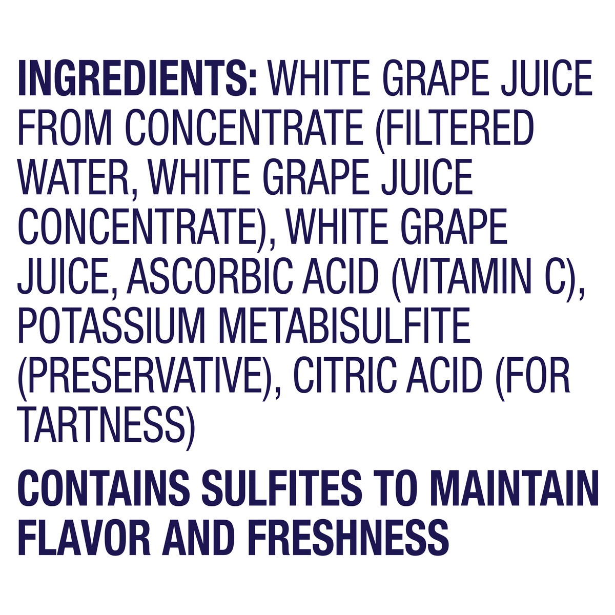 White Grape Juice from Concentrate (Filtered Water, White Grape Juice Concentrate), White Grape Juice, Ascorbic Acid (Vitamin C), Potassium Metabisulfite (Preservative), Citric Acid (for Tartness).
