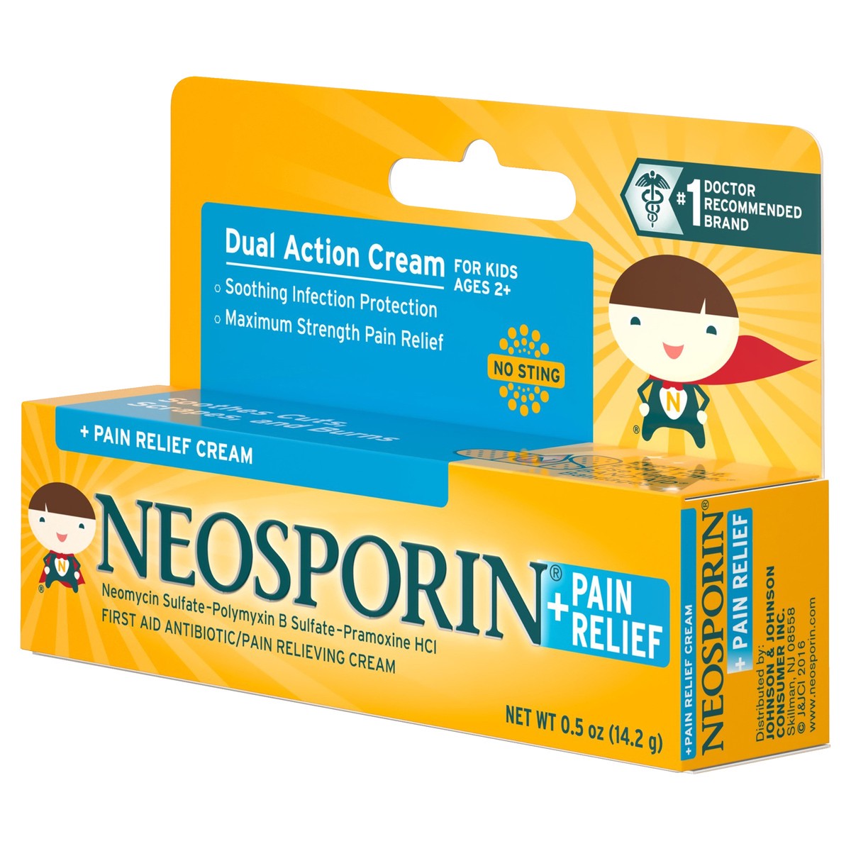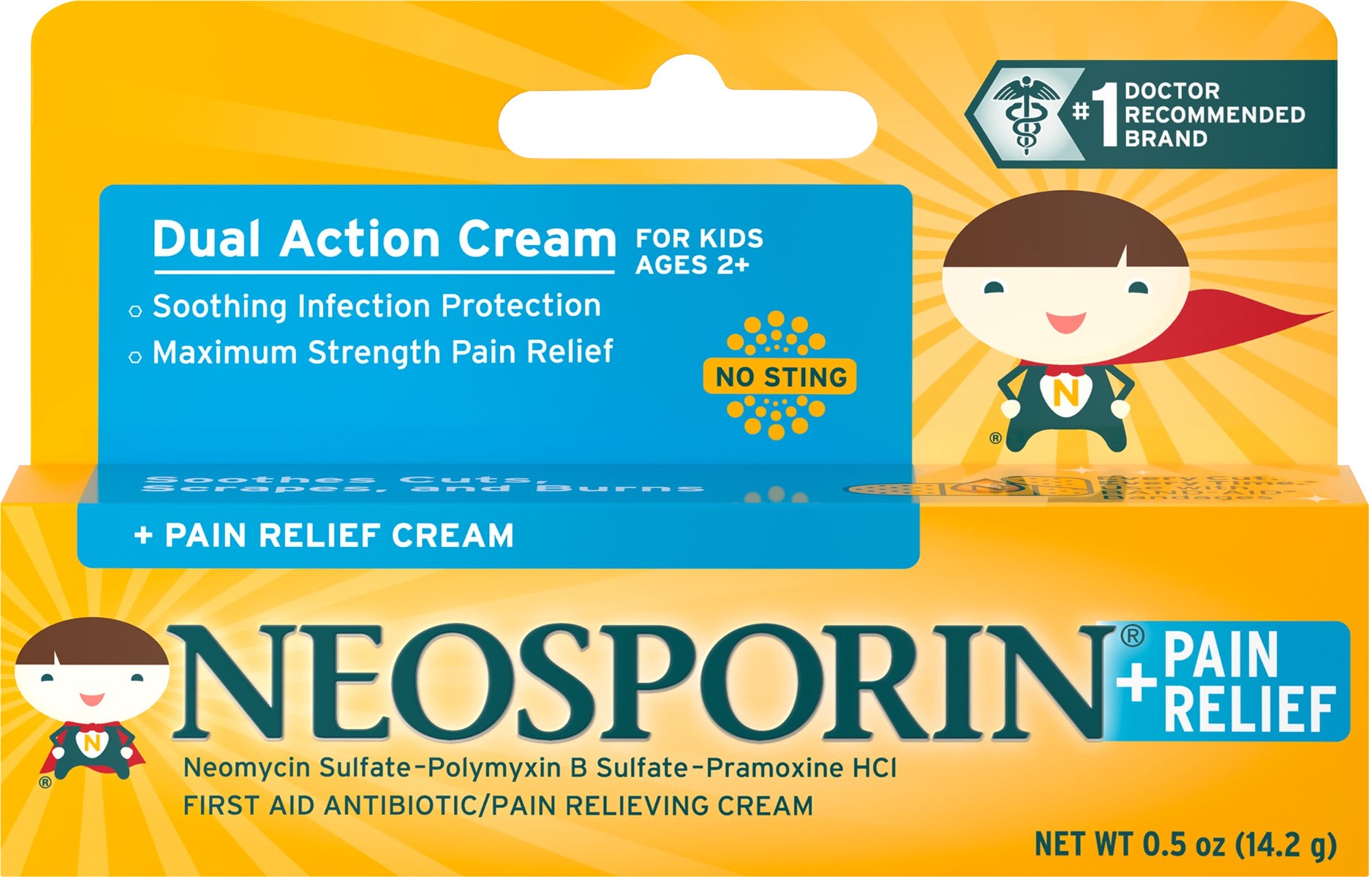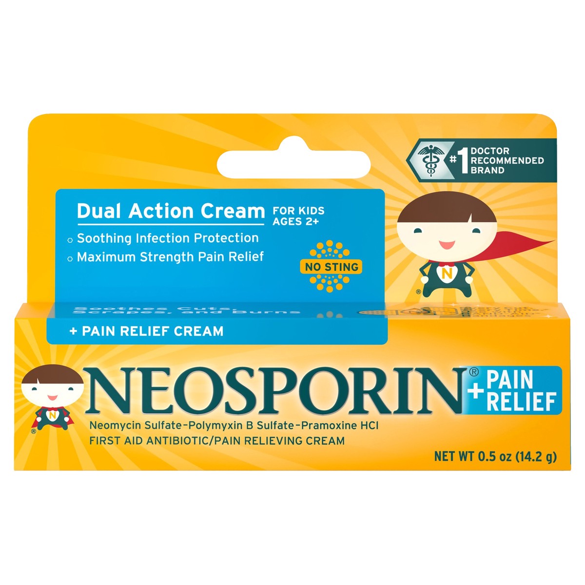 Neosporin + Pain Relief Cream for Kids is a fast-absorbing cream that soothes painful cuts, scrapes, and burns while helping prevent infection. Featuring first aid antibiotics neomycin and polymyxin B…