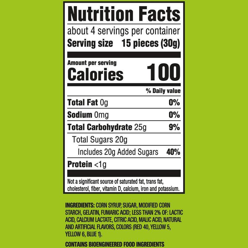 Corn Syrup, Sugar, Modified Corn Starch, Gelatin, Fumaric Acid; Less than 2% of: Lactic Acid, Calcium Lactate, Citric Acid, Malic Acid, Natural and Artificial Flavors, Colors (Red 40, Yellow 5, Yellow…