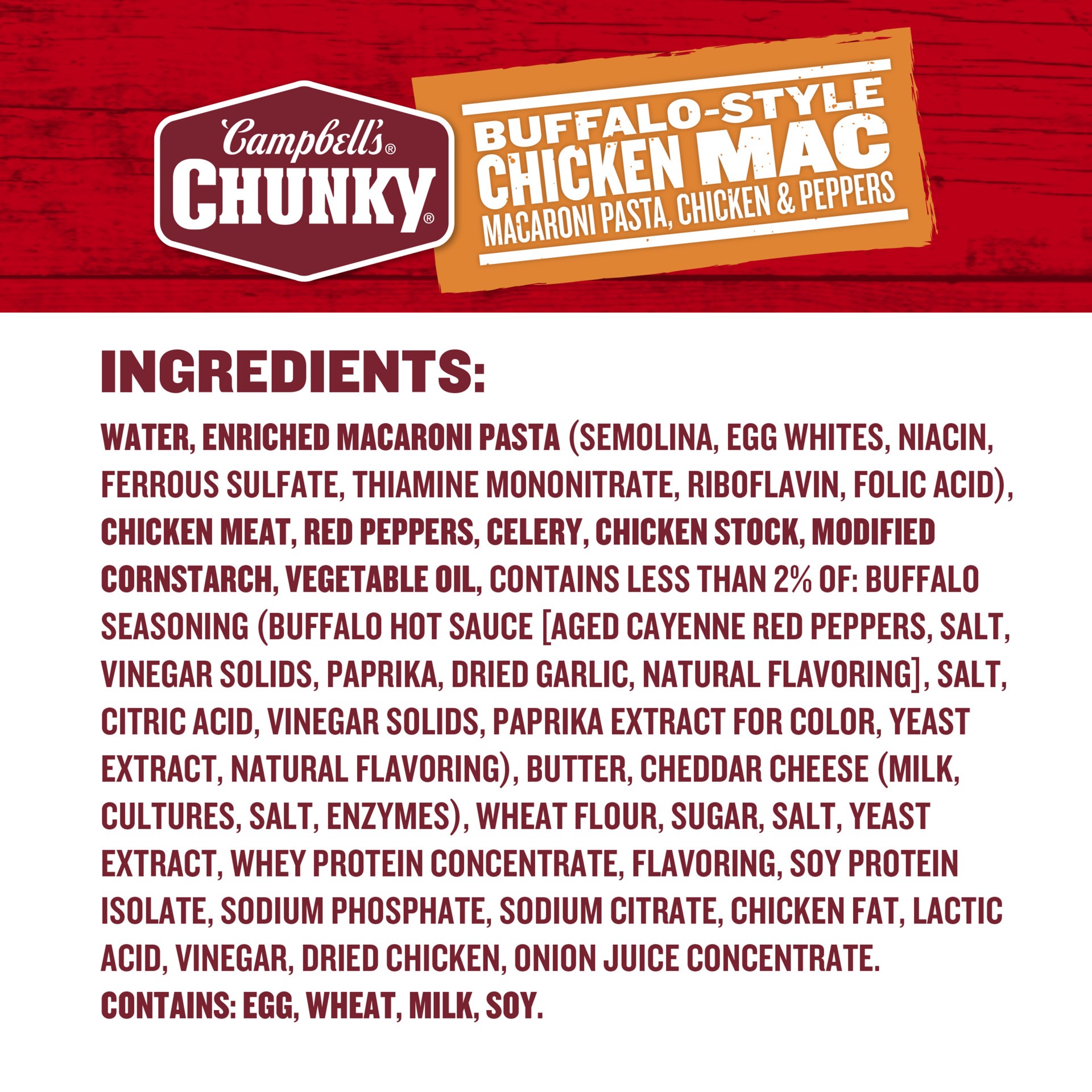 Tackle your hunger with Campbell''s Chunky Buffalo-Style Chicken Mac Soup. This Buffalo chicken mac and cheese soup features chicken meat with no antibiotics, enriched macaroni pasta, red peppers, che…
