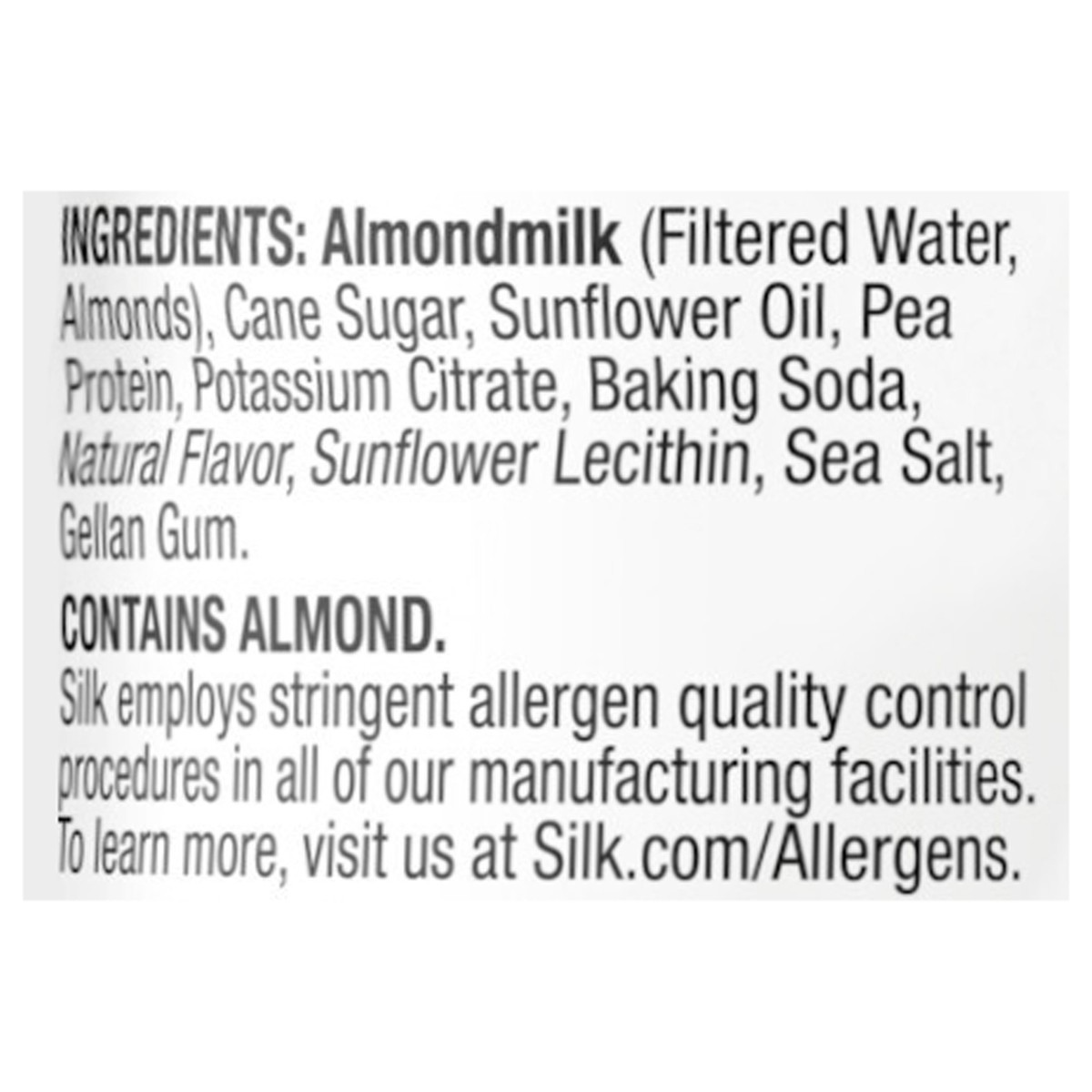 ALMONDMILK (FILTERED WATER, ALMONDS), CANE SUGAR, SUNFLOWER OIL, PEA PROTEIN, POTASSIUM CITRATE, BAKING SODA, NATURAL FLAVOR, SUNFLOWER LECITHIN, SEA SALT, GELLAN GUM.