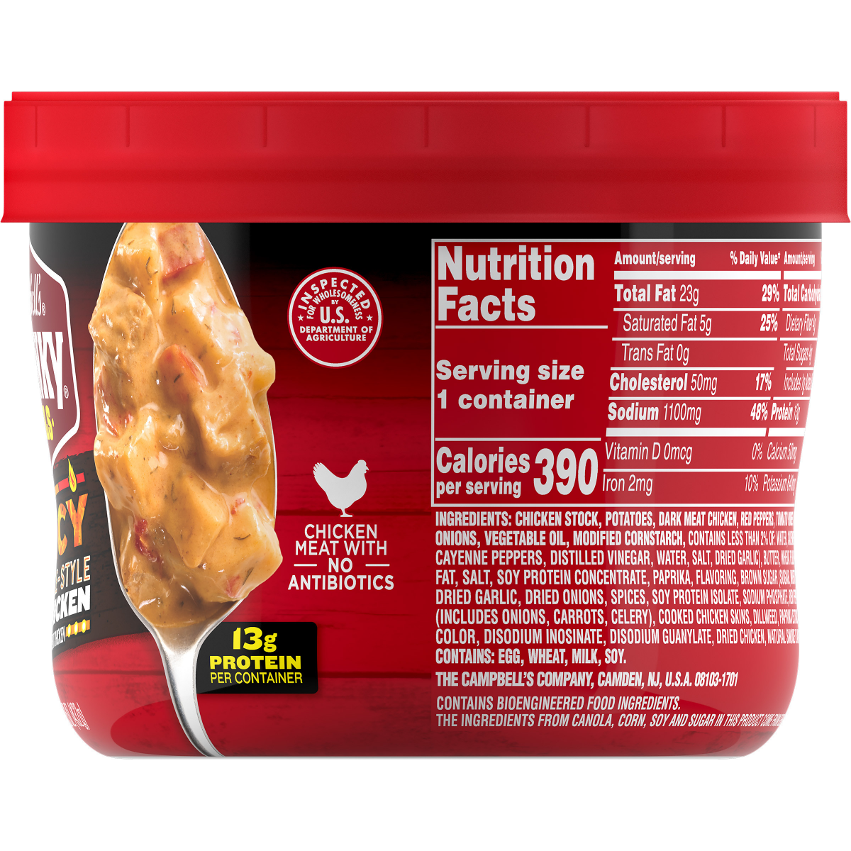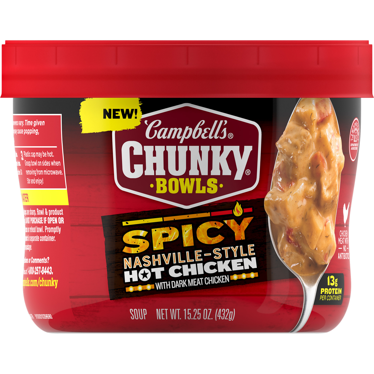 Turn up the heat on your hunger with Campbell’s Chunky Spicy Nashville-Style Hot Chicken Soup. Inspired by Nashville’s famous hot chicken, this spicy chicken soup features big pieces of dark chicken m…