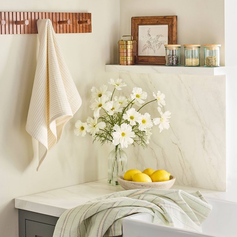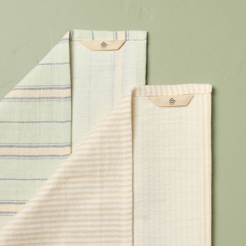 Give your kitchen a fresh update with this Set of 2 Striped Kitchen Towels from Hearth & Hand™ with Magnolia. This set of two kitchen towels includes one with a closely spaced stripe pattern and one w…