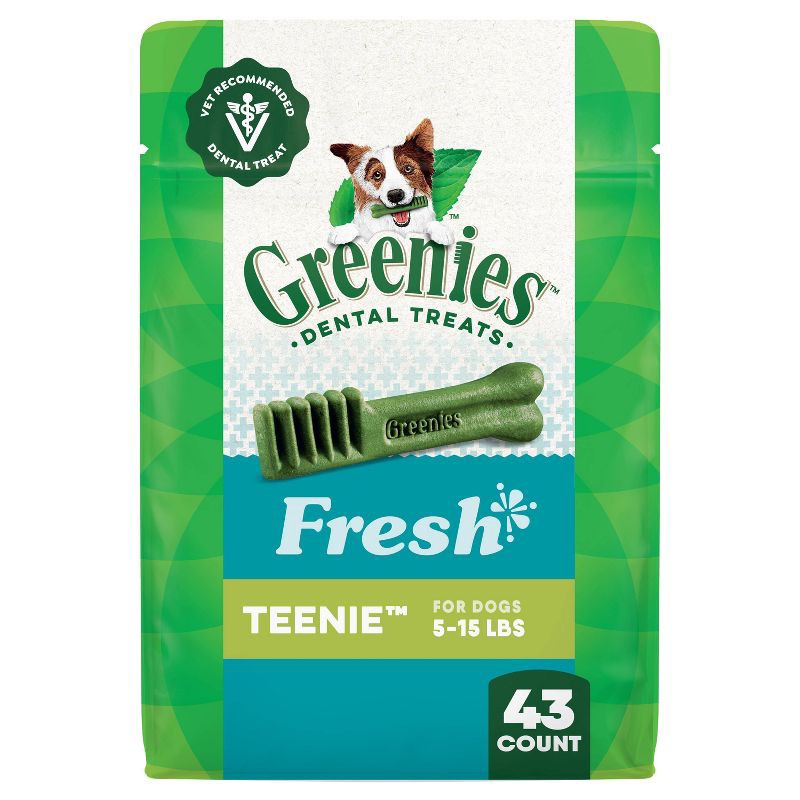 - 12 oz. Pack: Contains one (1) 12 oz. pack of Greenies Adult Dental Dog Treats Teenie Size, Fresh Flavor, 43 Count.