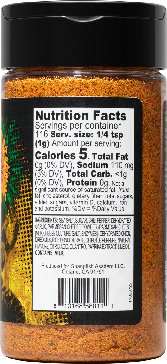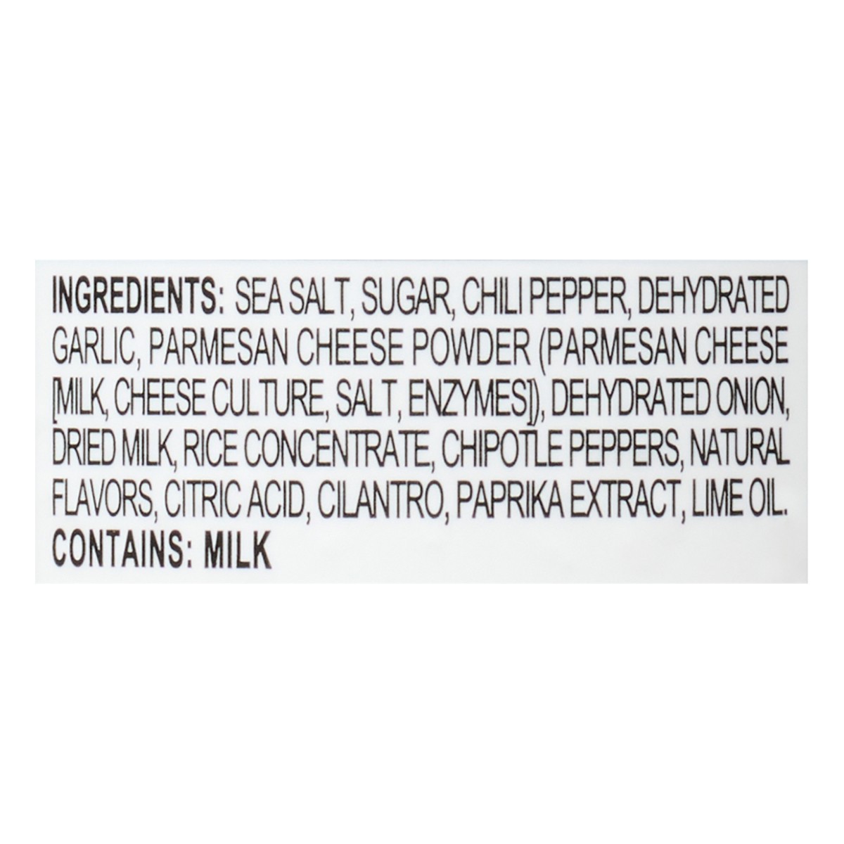 Sea Salt, Sugar, Chili Pepper, Dehydrated Garlic, Parmesan Cheese Powder (Parmesan Cheese [Milk, Cheese Culture, Salt, Enzymes]), Dehydrated Onion, Dried Milk, Rice Concentrate, Chipotle Peppers, Natu…