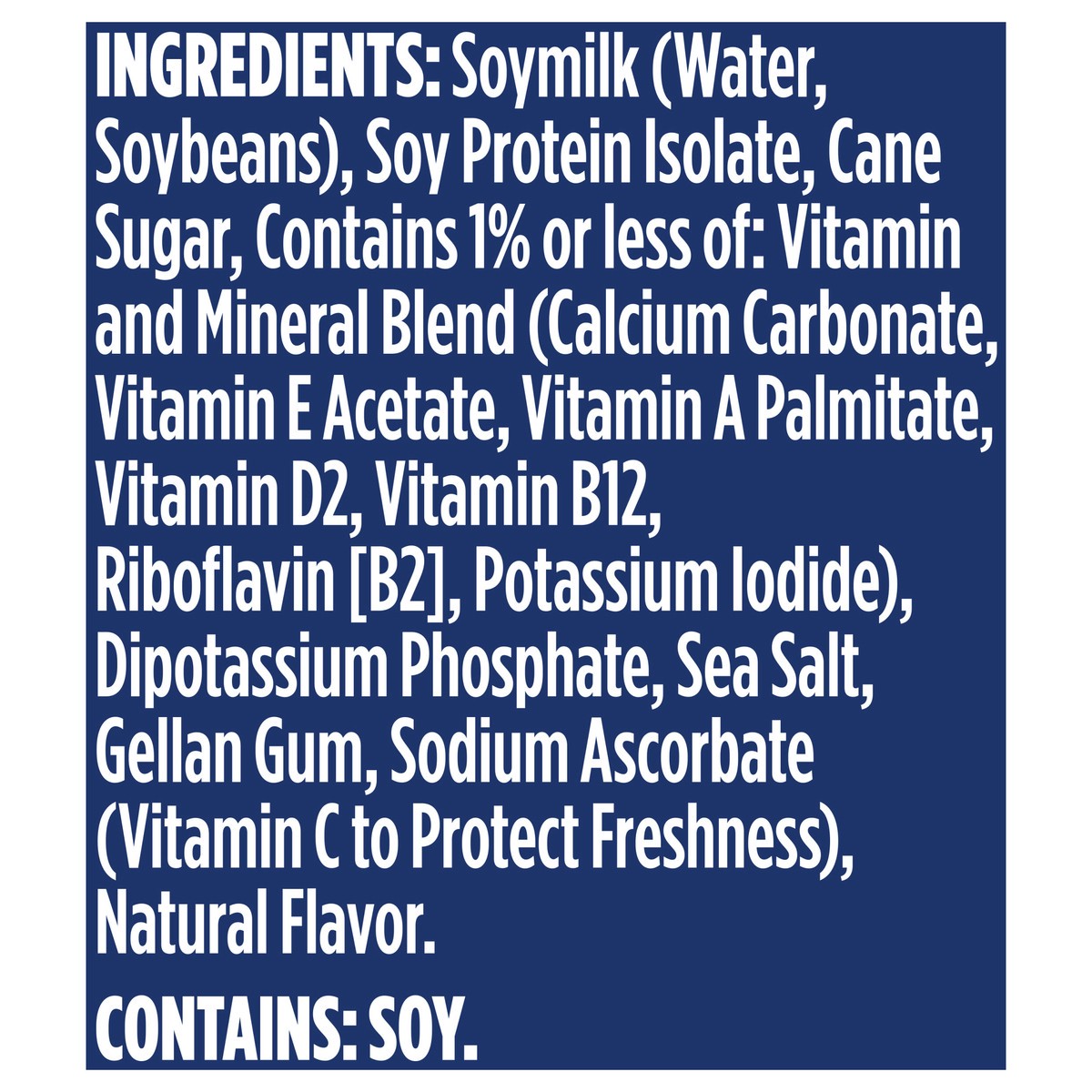 Soymilk (Water, Soybeans), Soy Protein Isolate, Cane Sugar, Contains 1% or Less of: Vitamin and Mineral Blend (Calcium Carbonate, Vitamin E Acetate, Vitamin A Palmitate, Vitamin D2, Vitamin B12, Ribof…