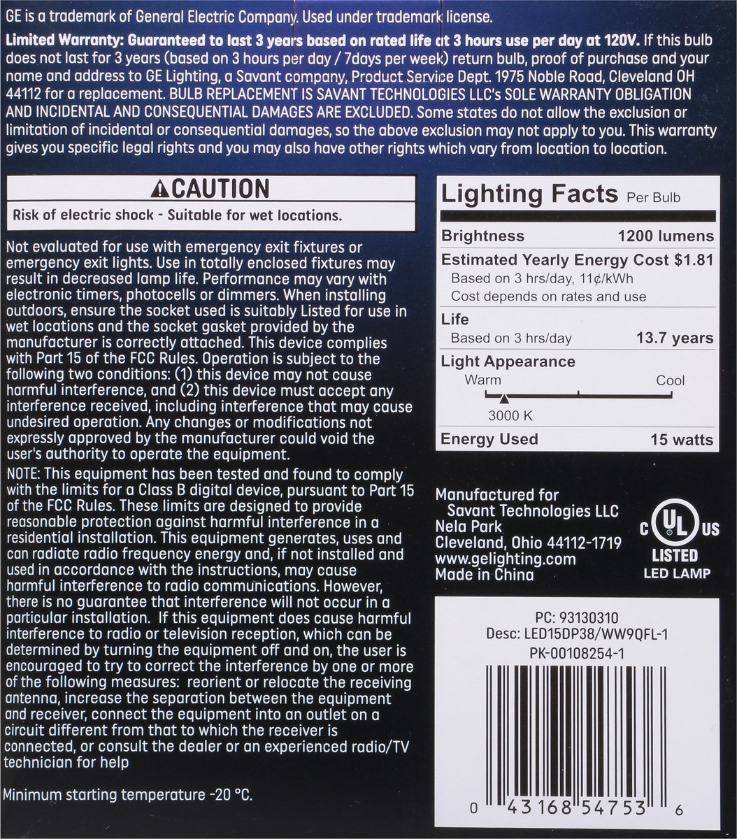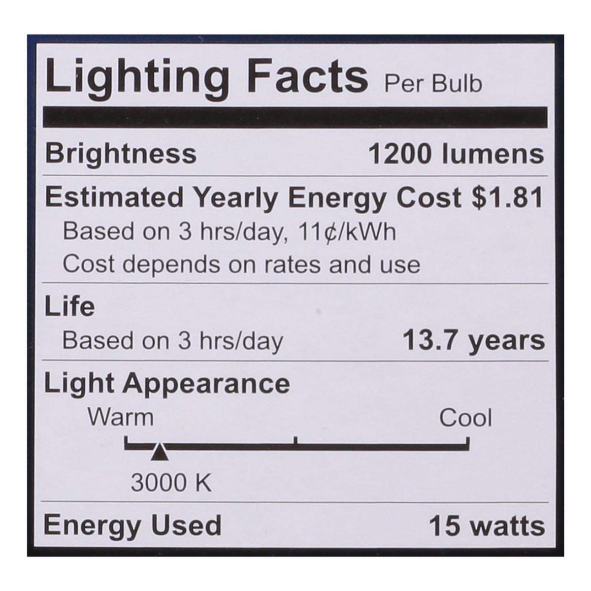 Brightness Quantity: 1200 lumens. Energy Info: $1.81 Based on 3 hrs/day, 11 cents/kWh. Cost depends on rates and use. 15 watts. Package Info: 1. Voltage: 120 V. Bulb Info: Outdoor. LED. Is Dimmable. I…