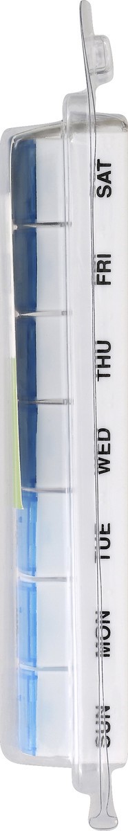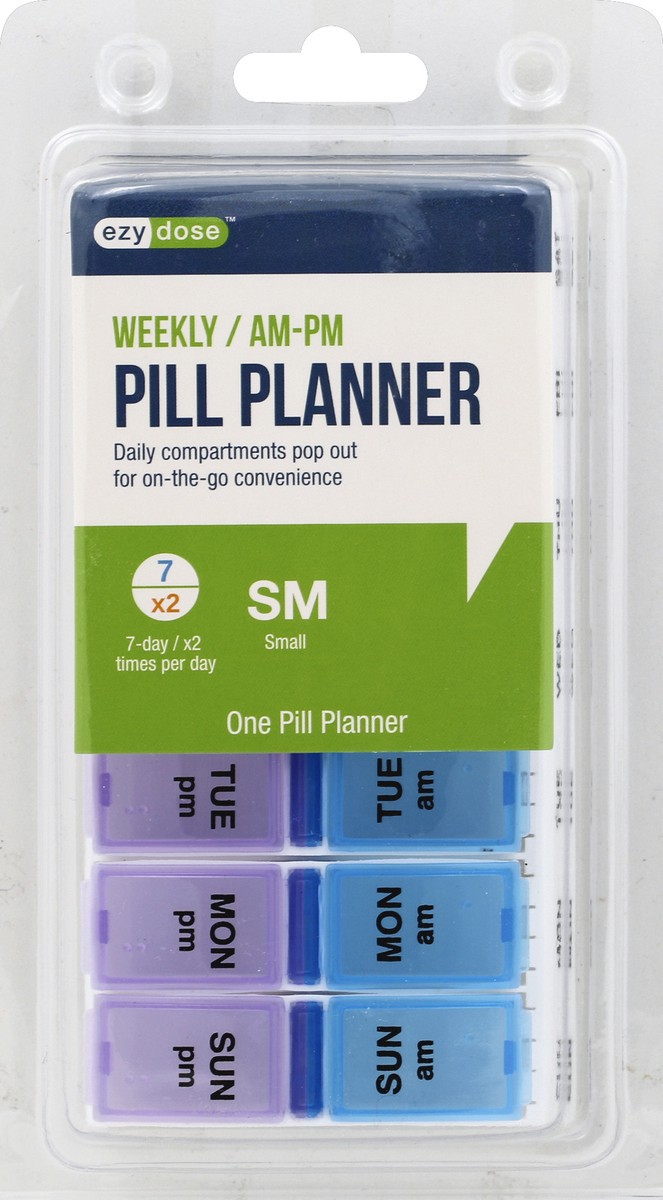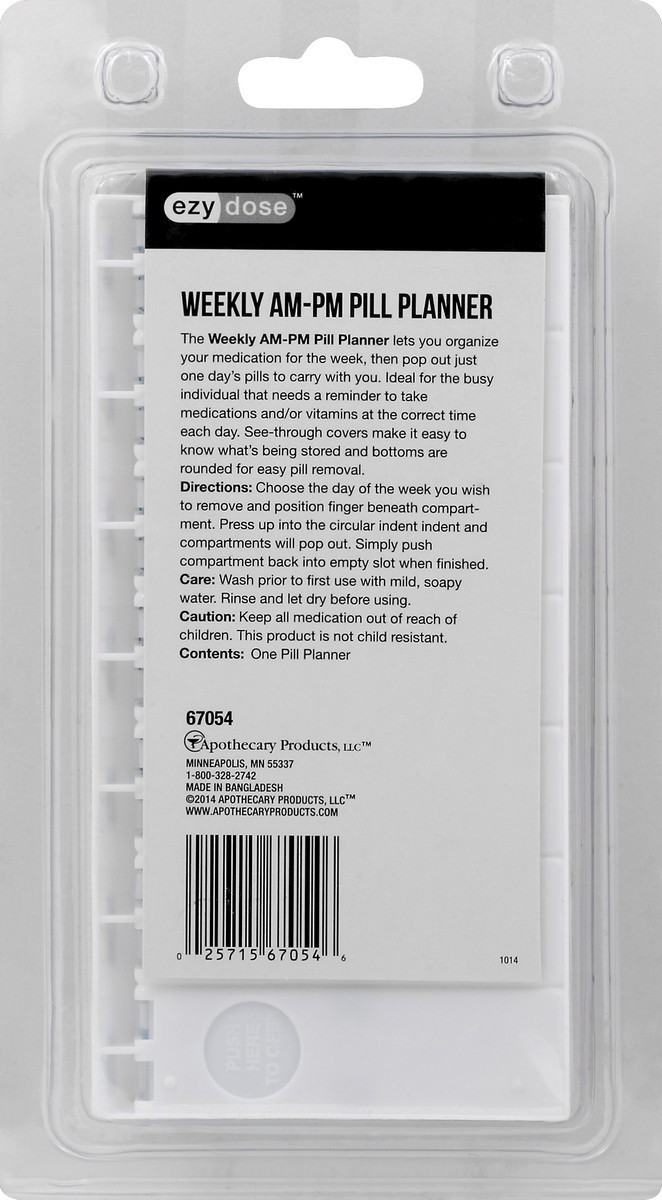 Contents: One Pill Planner. Daily compartments pop out for on-the-go convenience. 7-day/x2 times per day. The Weekly am-pm Pill Planner lets you organize your medication for the week, then pop out jus…