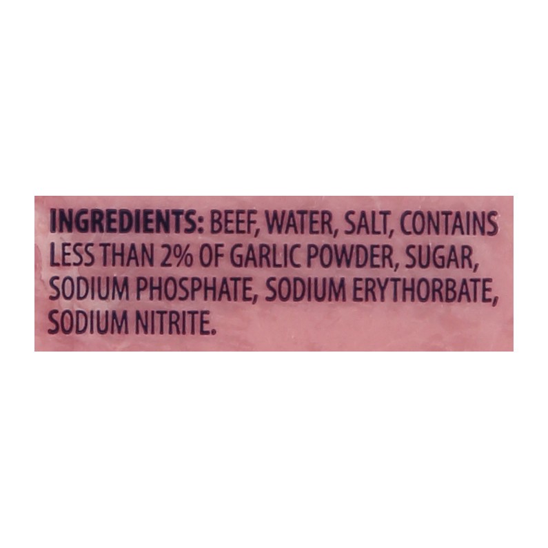 Beef, Water, Salt, Contains Less than 2% of Garlic Powder, Sugar, Sodium Phosphate, Sodium Erythorbate, Sodium Nitrite.