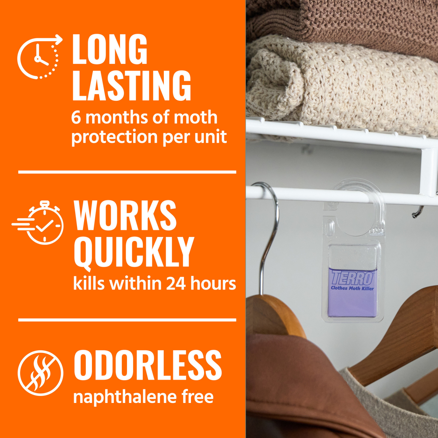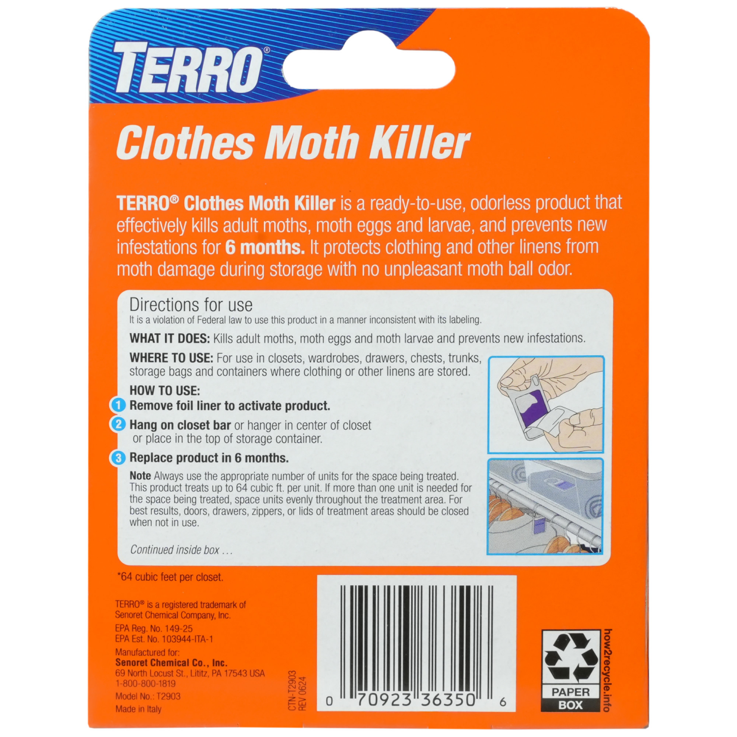 Don't let moths dine on your best dinner jacket or your favorite sweater. TERRO Clothes Moth Killer effectively kills adult moths, moth eggs and larvae, and prevents new infestations for up to 6 month…