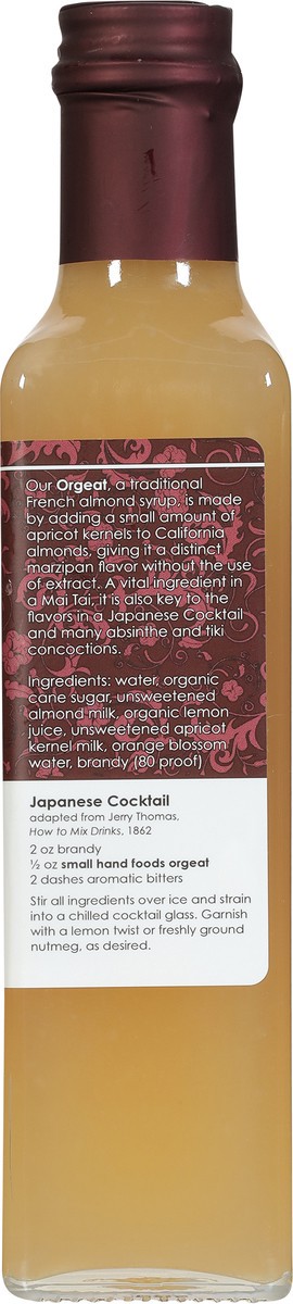 Orgeat is a French almond syrup, originally made from barley. Made from California almonds and a small proportion of apricot kernels to give a distinct marzipan flavor without the addition of extract.