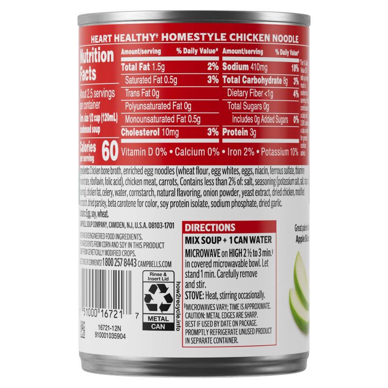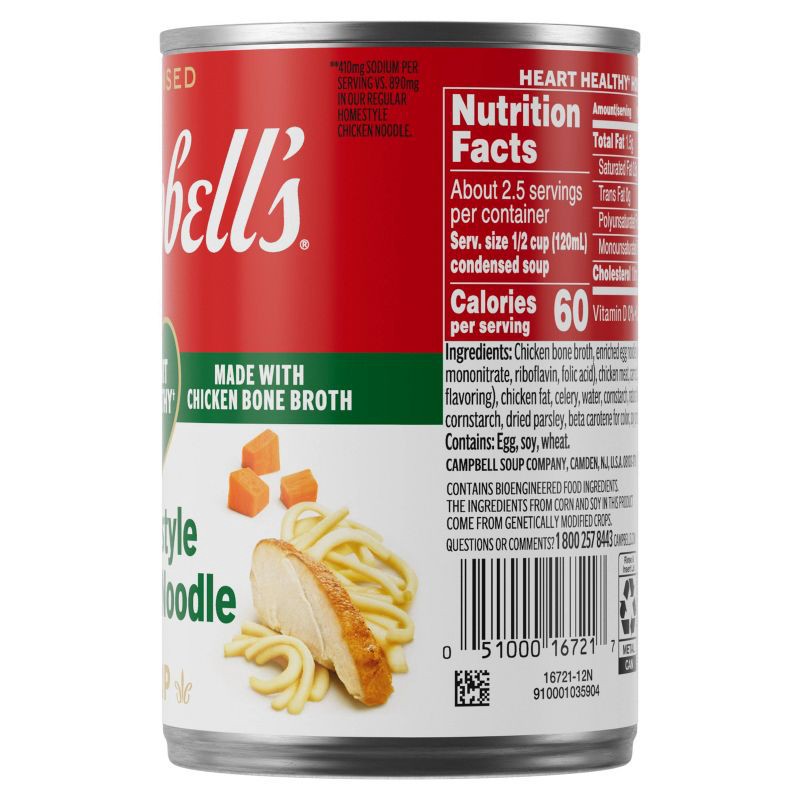 Cozy up with a steamy bowl of Campbell's Condensed Heart Healthy* Homestyle Chicken Noodle Soup. This delicious chicken soup is crafted with chicken bone broth, egg noodles, and tender chicken meat wi…