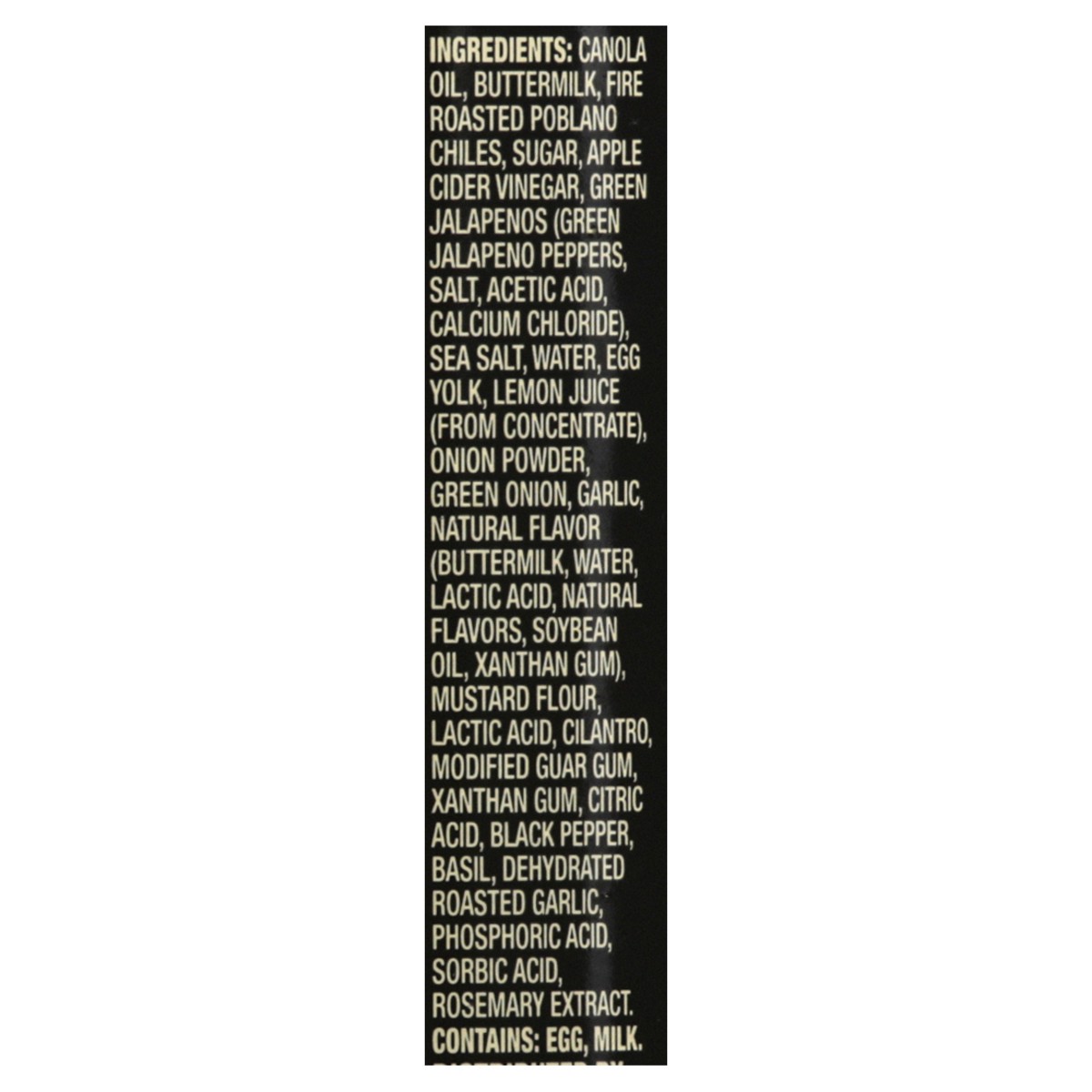 Canola Oil, Buttermilk, Fire Roasted Poblano Chiles, Sugar, Apple Cider Vinegar, Green Japalenos (Green Jalapeno Peppers), Salt, Acetic Acid, Calcium Chloride), Sea Salt, Water, Egg Yolk, Lemon Juice …
