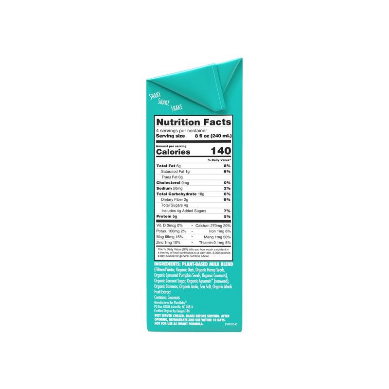 PLANT-BASED MILK BLEND (FILTERED WATER, ORGANIC OATS, ORGANIC HEMP SEEDS, ORGANIC SPROUTED PUMPKIN SEEDS, ORGANIC COCONUTS), ORGANIC COCONUT SUGAR, ORGANIC AQUAMIN (SEAWEED), ORGANIC BANANAS, ORGANIC …