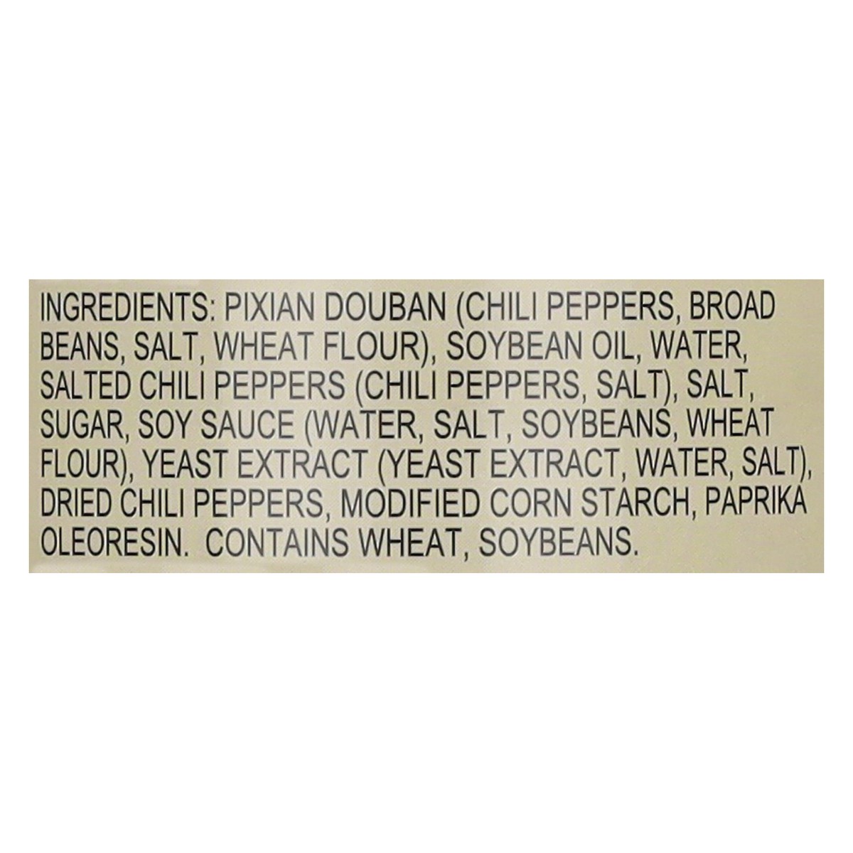 Pixian Douban (Chili Peppers, Broad Beans, Salt, Wheat Flour), Soybean Oil, Water, Salted Chili Peppers (Chili Peppers, Salt), Salt, Sugar, Soy Sauce (Water, Salt, Soybeans, Wheat Flour), Yeast Extrac…
