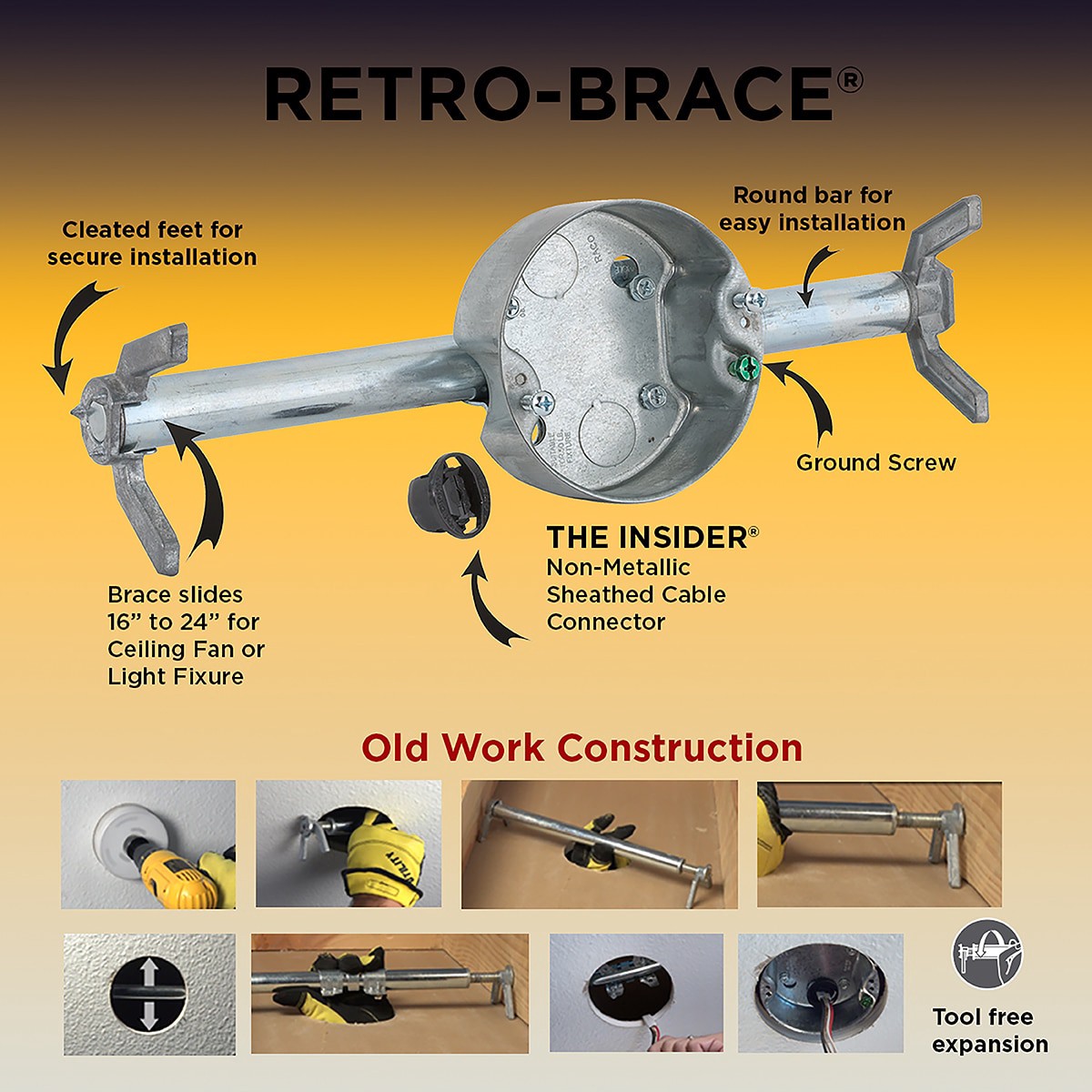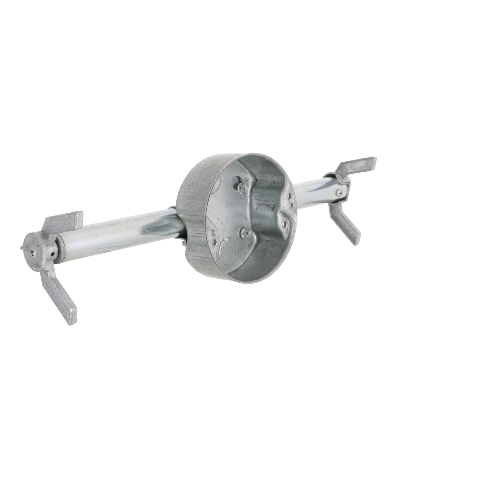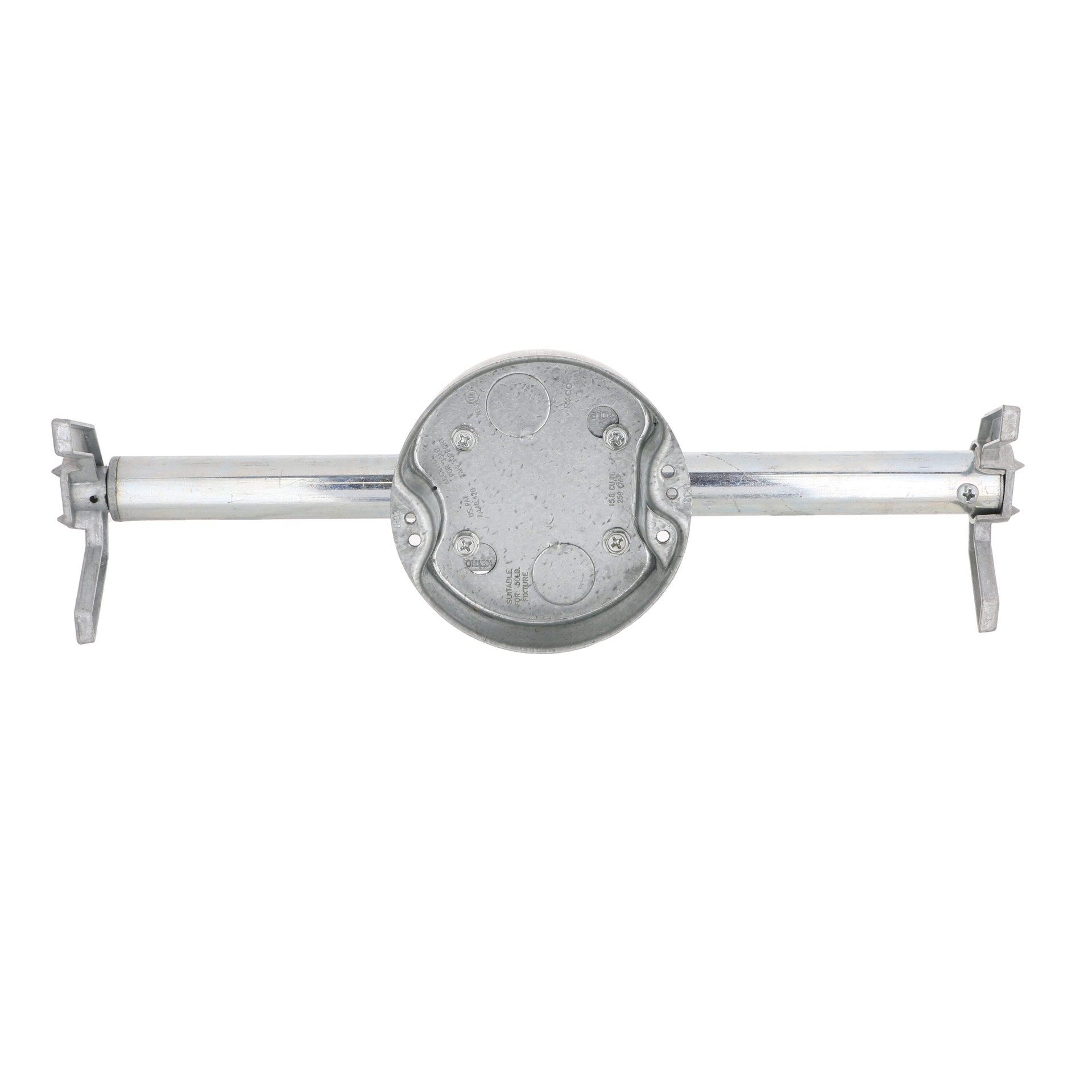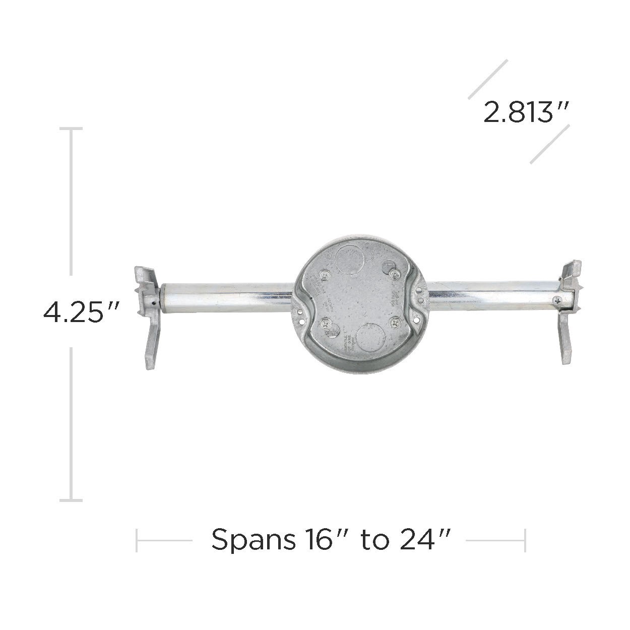 Two 1/2 in knockouts. 1-1/2 in deep. 16 in joist span, supports 70 lb ceiling fan. 24 in joist span, supports 35 lb ceiling fan. 16 in joist span, supports 110 lb light fixture. 24 in joist span, supp…