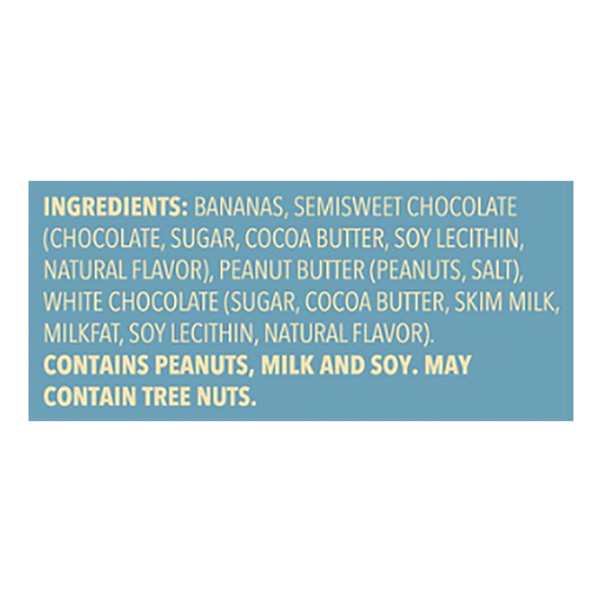 Bananas, Semisweet Chocolate (Chocolate, Sugar, Cocoa Butter, Soy Lecithin, Natural Flavor), Peanut Butter (Peanuts, Salt), White Chocolate (Sugar, Cocoa Butter, Skim Milk, Milkfat, Soy Lecithin, Natu…
