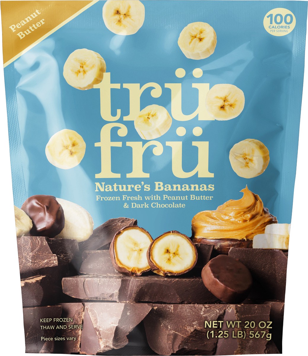 Tru Fru's fresh frozen fruit, indulgent snack contains bananas fully ripened and immersed in peanut butter and dark chocolate. Our real chocolate makes fruit better by complementing the fresh flavor o…