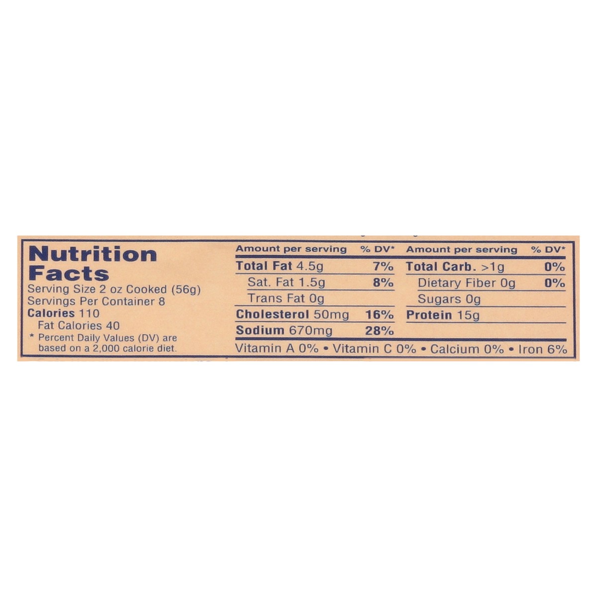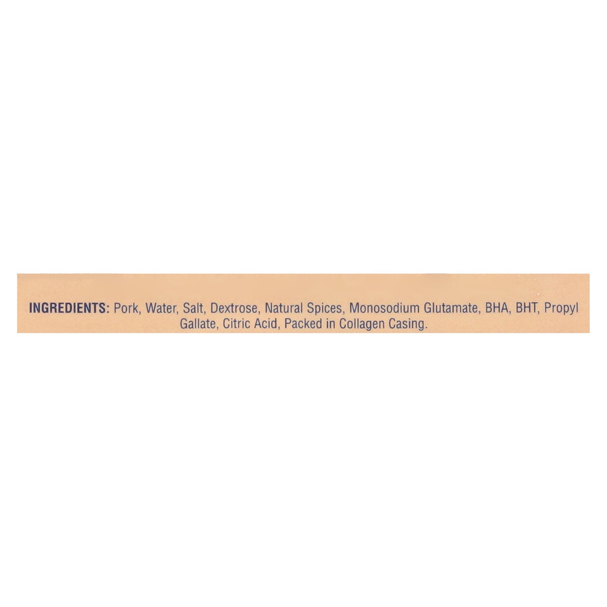 Pork, Water, Salt, Dextrose, Natural Spices, Monosodium Glutamate, BHA, BHT, Propyl Gallate, Citric Acid, Packed in Collagen Casing.