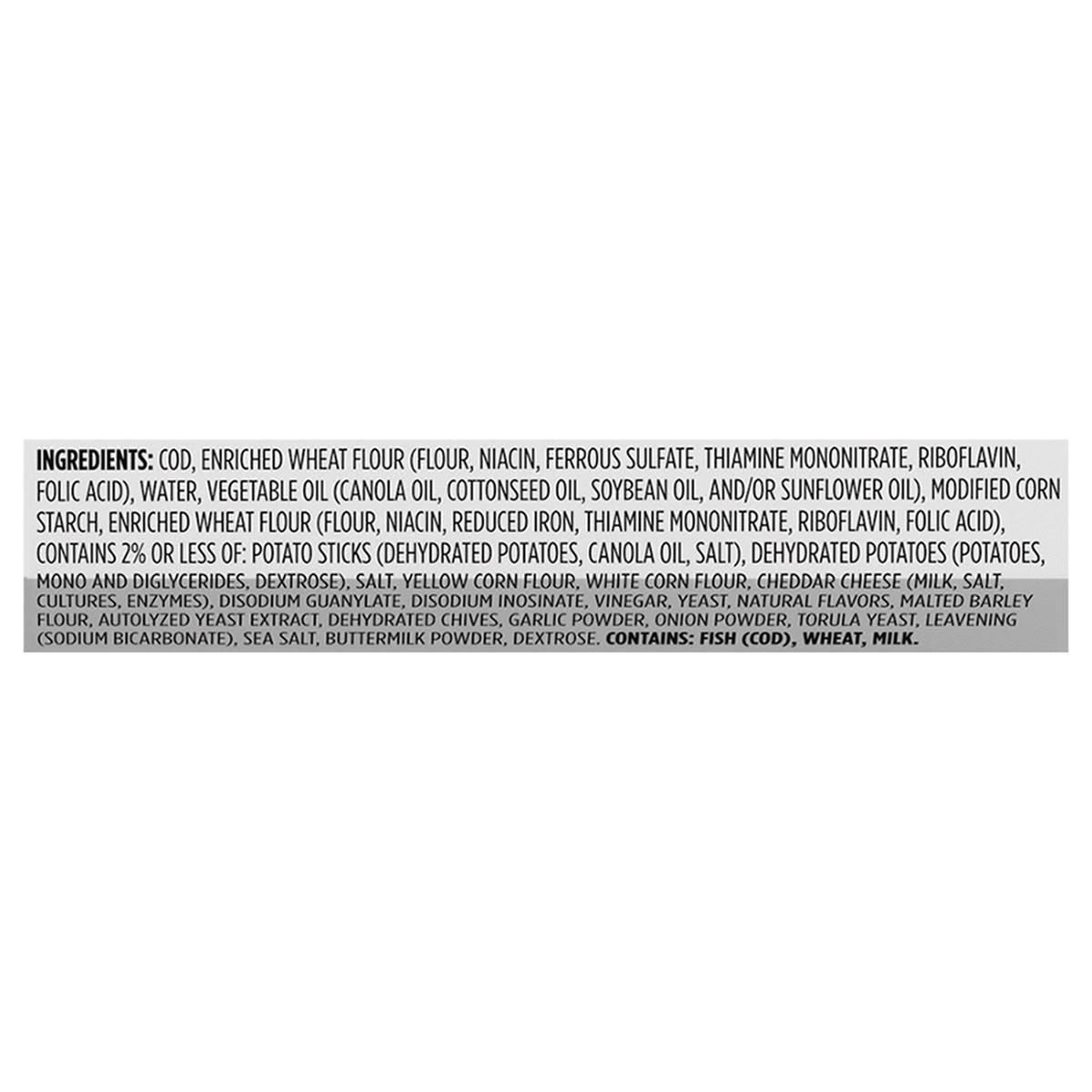 Cod, Enriched Wheat Flour (Flour, Niacin, Ferrous Sulfate, Thiamine Mononitrate, Riboflavin, Folic Acid), Water, Vegetable Oil (Canola Oil, Cottonseed Oil, Soybean Oil, and/or Sunflower Oil), Modified…