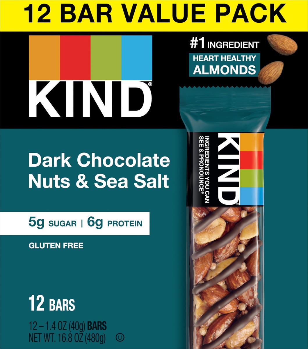 KIND Healthy Snack Bar Value Pack, Dark Chocolate Nuts & Sea Salt, 5g Sugar | 6g Protein, Gluten Free Bars, 1.4 OZ, 12 Count