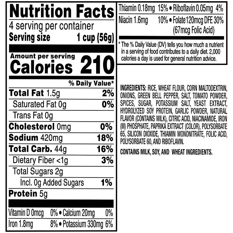 Rice, Wheat Flour, Corn Maltodextrin, Onions, Green Bell Pepper, Salt, Tomato Powder, Spices, Sugar, Potassium Salt, Yeast Extract, Hydrolyzed Soy Protein, Garlic Powder, Natural Flavor (Contains Milk…