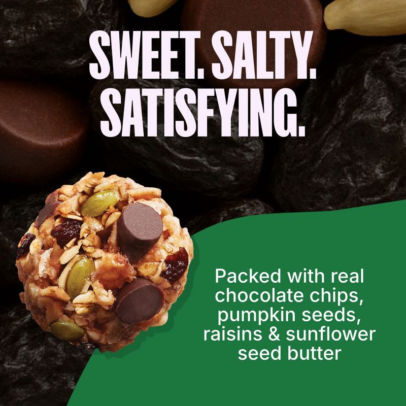 - TRAIL MIX IN ONE BITE: Made with chocolate chips, pumpkin seeds, raisins, dried cranberries, and sunflower seed butter, this snack is everything you love about trail mix, packed into a granola bite.