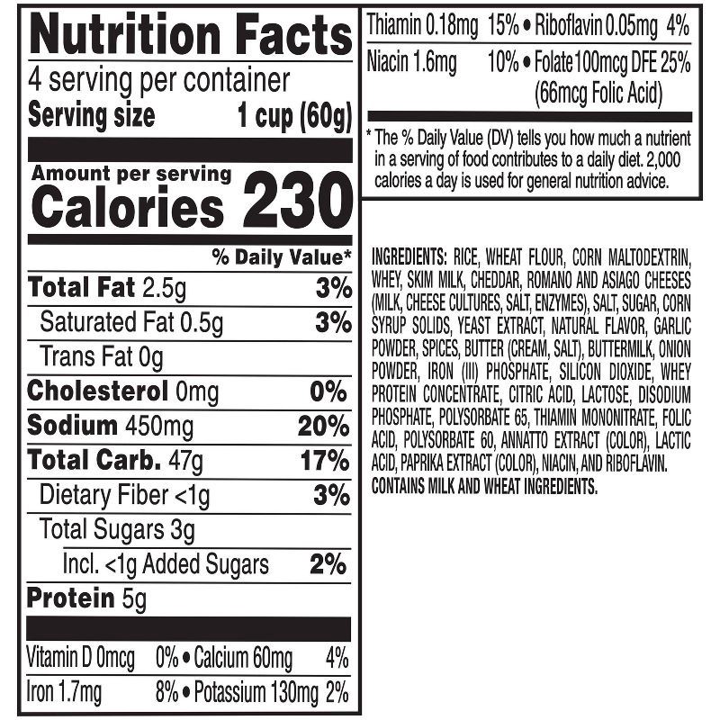 Rice, Wheat Flour, Corn Maltodextrin, Whey, Skim Milk, Cheddar, Romano and Asiago Cheeses (Milk, Cheese Cultures, Salt, Enzymes), Salt, Sugar, Corn Syrup Solids, Yeast Extract, Natural Flavor, Garlic …