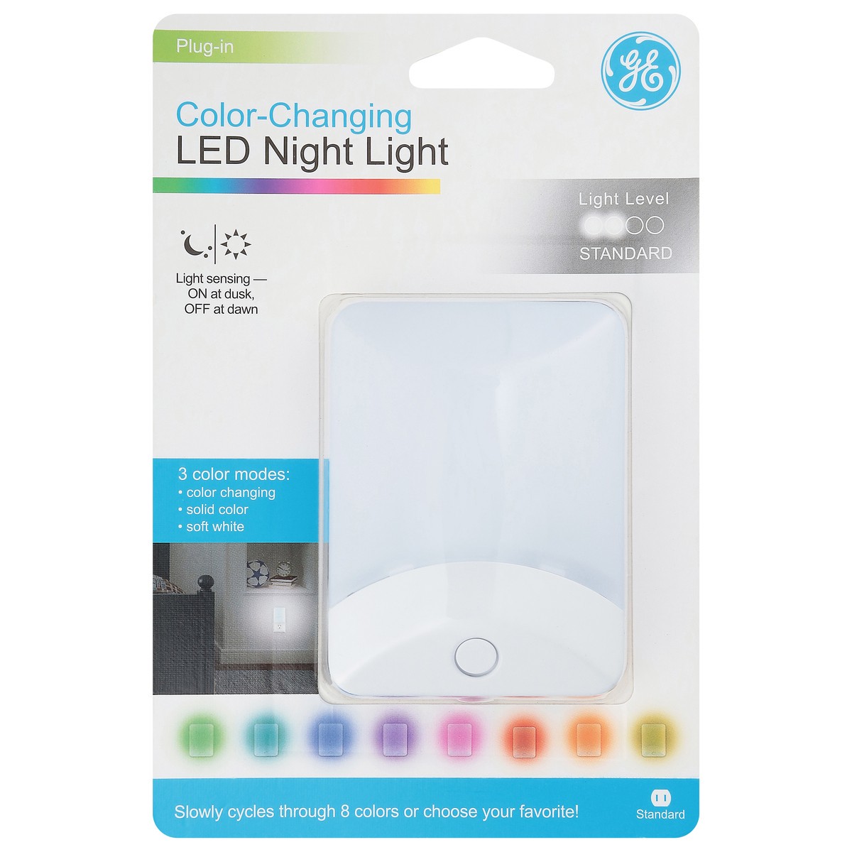 Light sensing: On at dusk off at dusk, off at dawn. Light level. standard. 3 Color Modes: Color changing. Solid color. Soft white. Slowly cycles through 8 colors or choose your favorite! Light Level: …