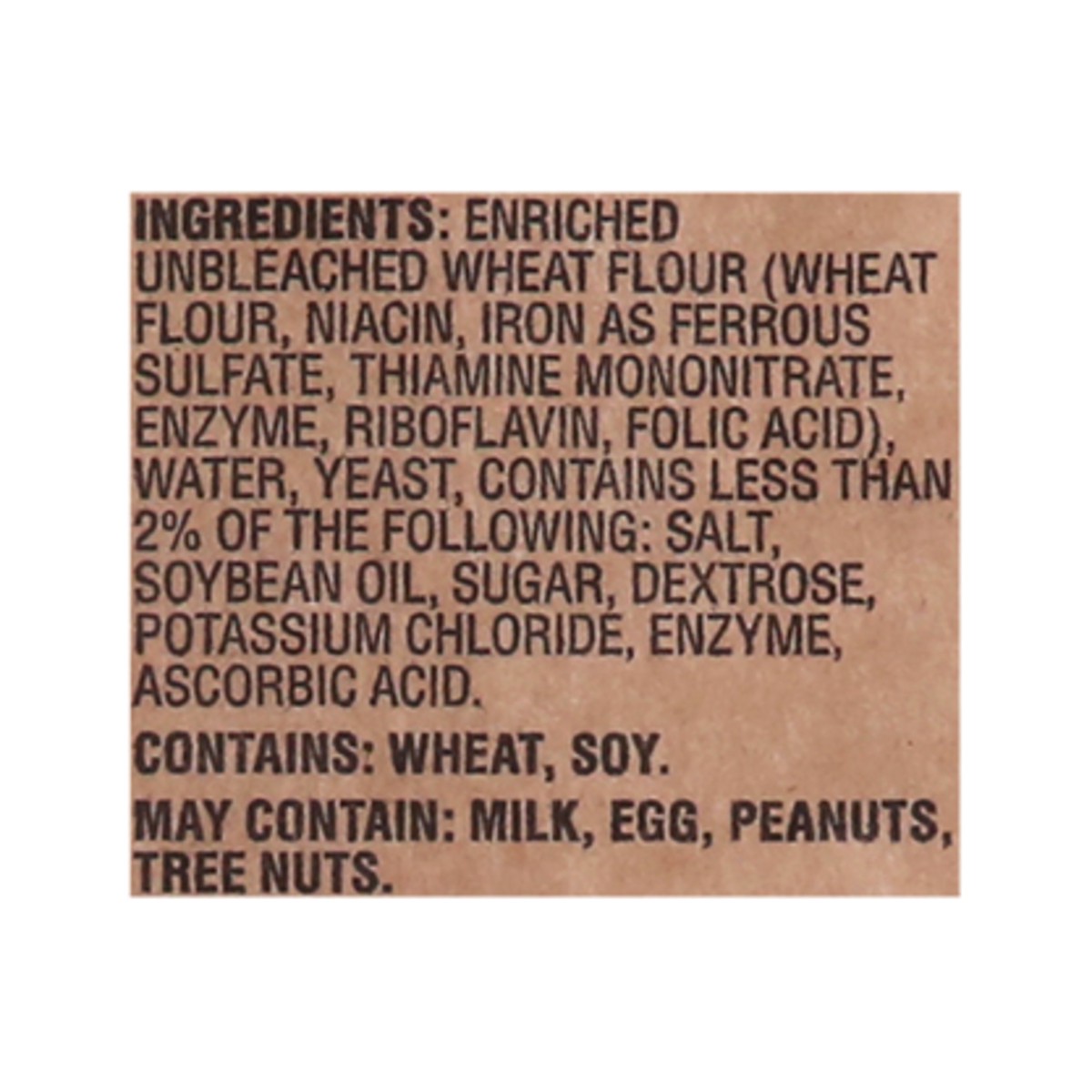 Enriched Unbleached Wheat Flour (Wheat Flour, Niacin, Iron as Ferrous Sulfate, Thiamine Mononitrate, Enzyme, Riboflavin, Folic Acid), Water Yeast, Contains Less than 2% of the Following: Salt, Soybean…