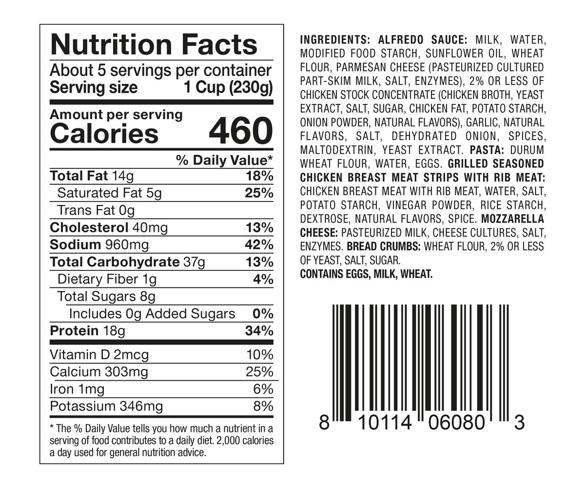 Alfredo Sauce: Milk, Water, Modified Food Starch, Sunflower Oil, Wheat Flour, Parmesan Cheese (Pasteurized Cultured Part-Skim Milk, Salt, Enzymes), 2% or Less of Chicken Stock Concentrate (Chicken Bro…