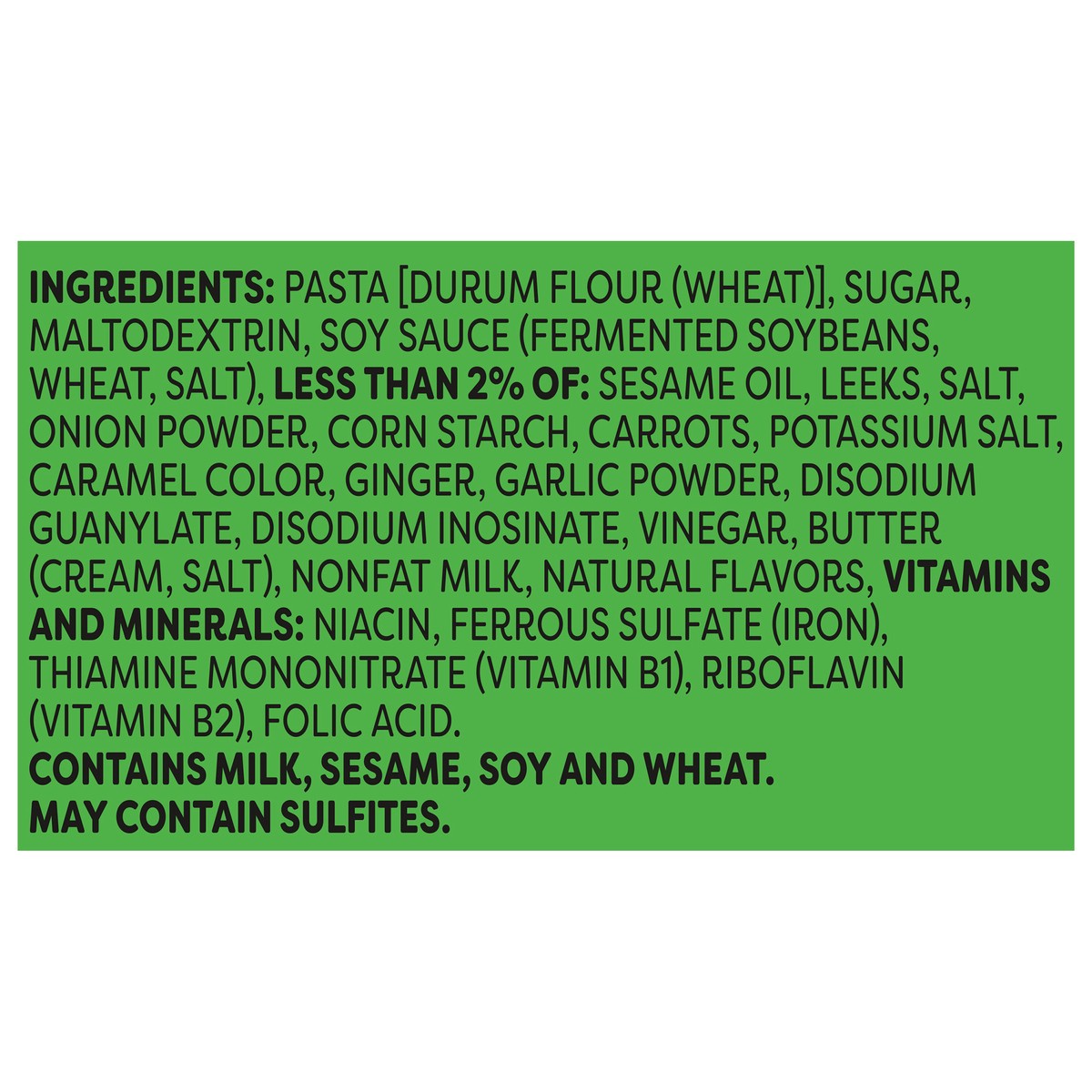 Pasta [Durum Flour (Wheat)], Sugar, Maltodextrin, Soy Sauce (Fermented Soybeans, Wheat, Salt), Less than 2% of: Sesame Oil, Leeks, Salt, Onion Powder, Corn Starch, Carrots, Potassium Salt, Caramel Col…