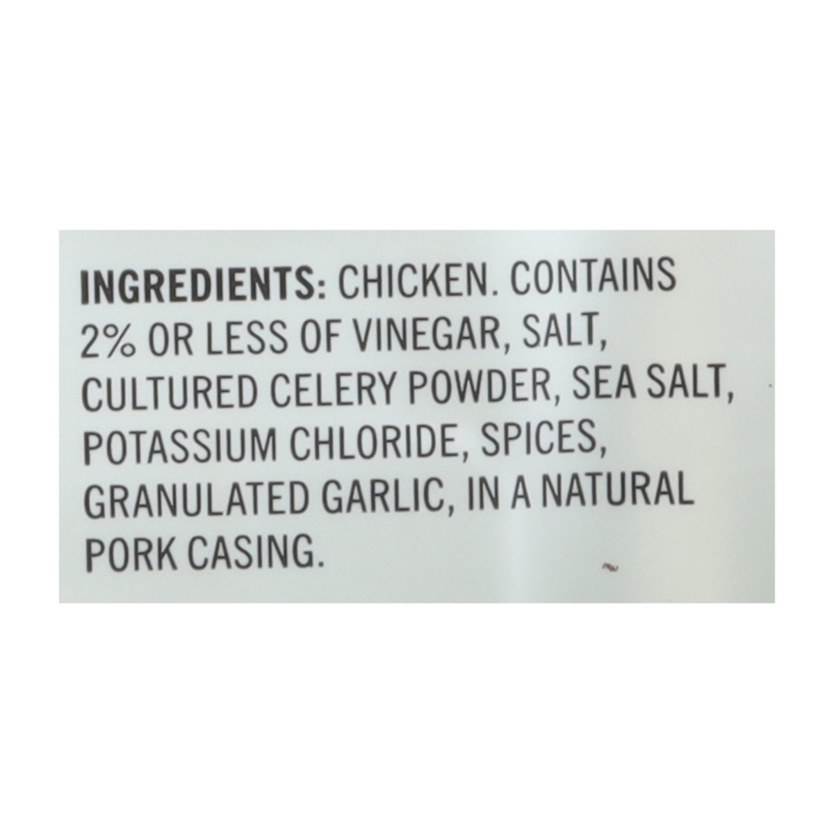 Chicken, Contains 2% or Less of Vinegar, Salt, Cultured Celery Powder, Sea Salt, Potassium Chloride, Spices, Granulated Garlic, in a Natural Pork Casing.