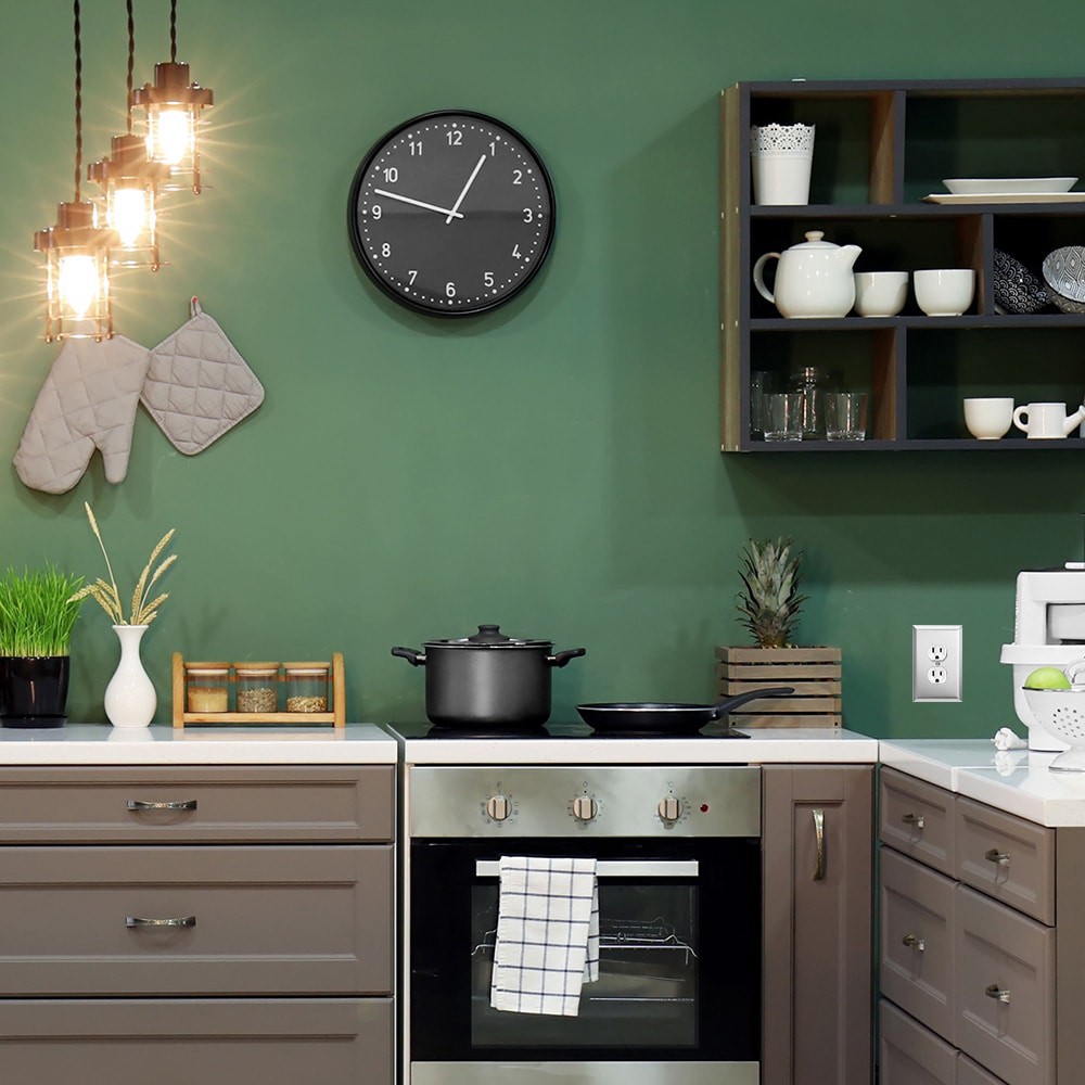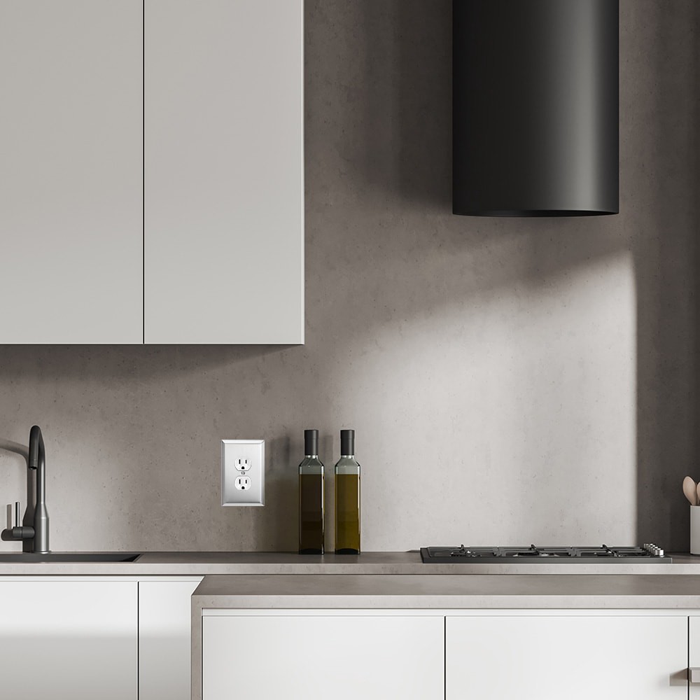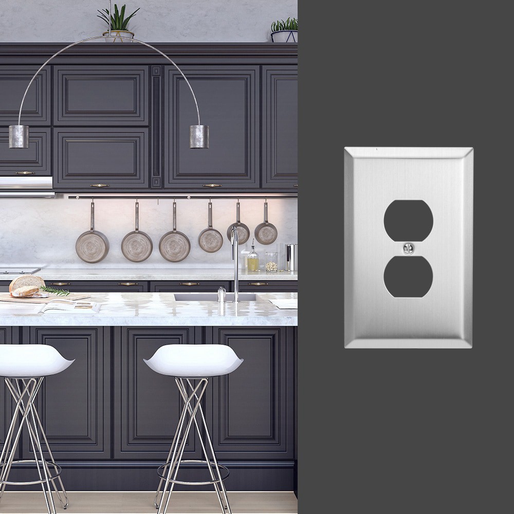 Duplex configuration. Solid sound compared to thin, hollow resonance of economy plastic plates. Will not crack, peel or discolor over time. Brushed nickel finish. Includes mounting screw(s) in matchin…