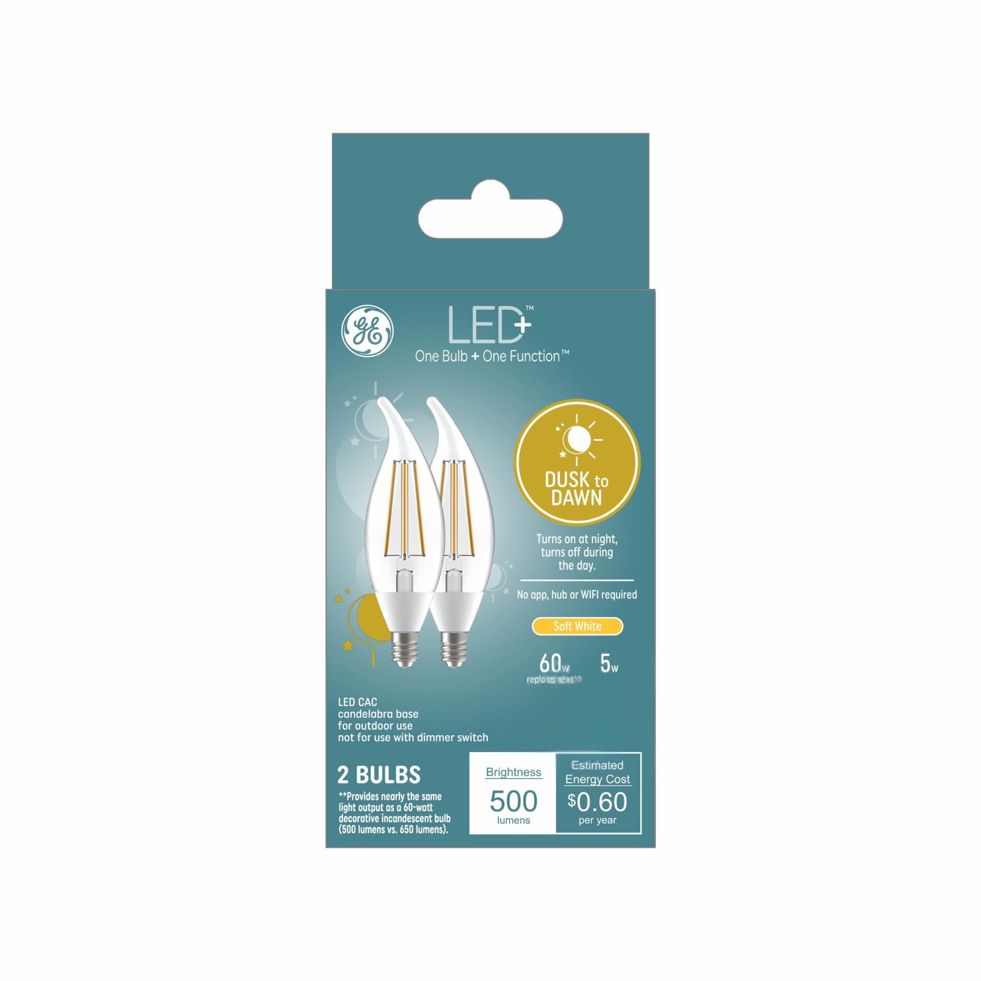 GE LED+ Dusk to Dawn 60 -Watt EQ CAC Soft white Candelabra screw base E12 LED Decorative Light Bulb 2 -Pack