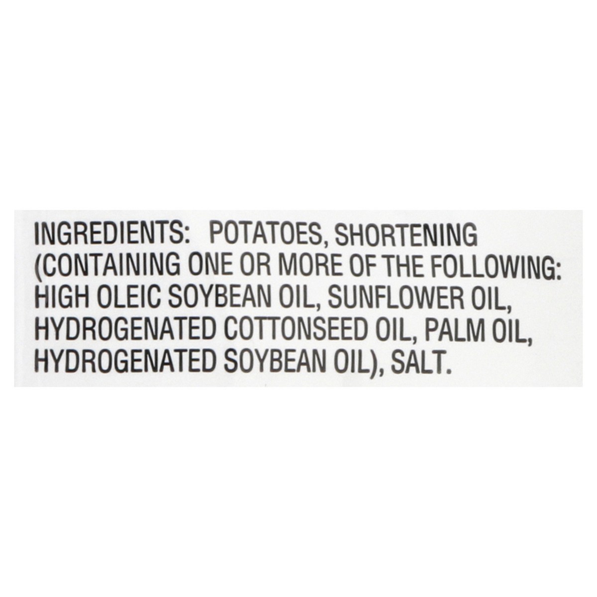 Potatoes, Shortening (Containing One or More of the Following High Oleic Soybean Oil, Sunflower Oil, Hydrogenated Cottonseed Oil, Palm Oil, Hydrogenated Soybean Oil), Salt.