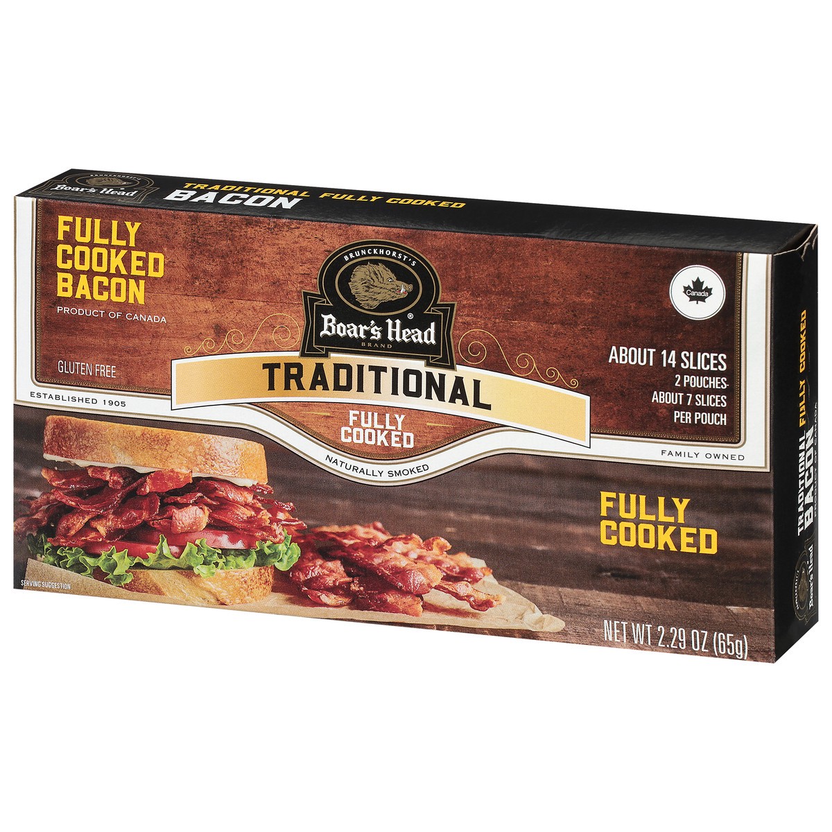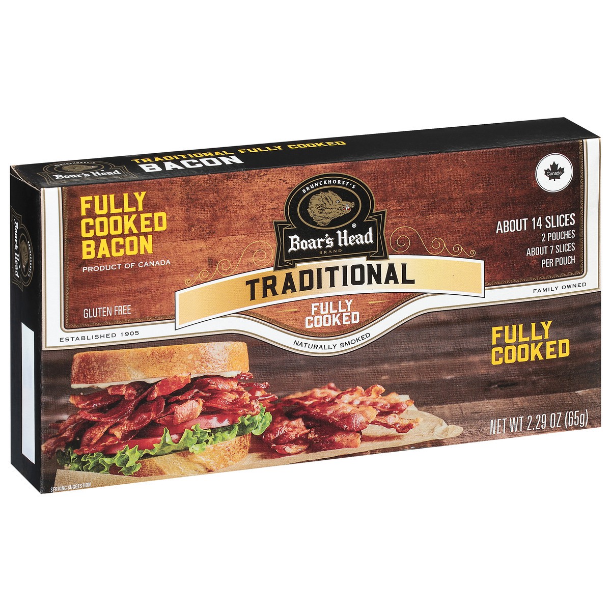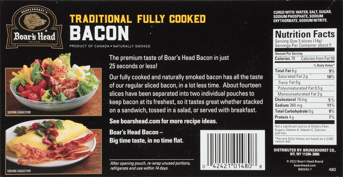 Crafted with top-quality pork belly, this bacon is smoked with hardwood chips and cooked to perfection. Boar's Head Naturally Smoked Bacon packs farm-fresh flavor into each fully cooked slice.
