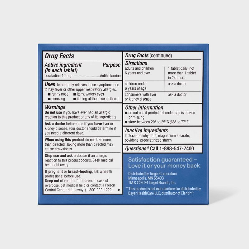 - ALLERGY MEDICINE: Loratadine Tablets 10 mg temporarily relieves symptoms due to hay fever or other upper respiratory allergies: runny nose; itchy, watery eyes; sneezing; itching of the nose or throat. Compare to Claritin® Tablets active ingredient.