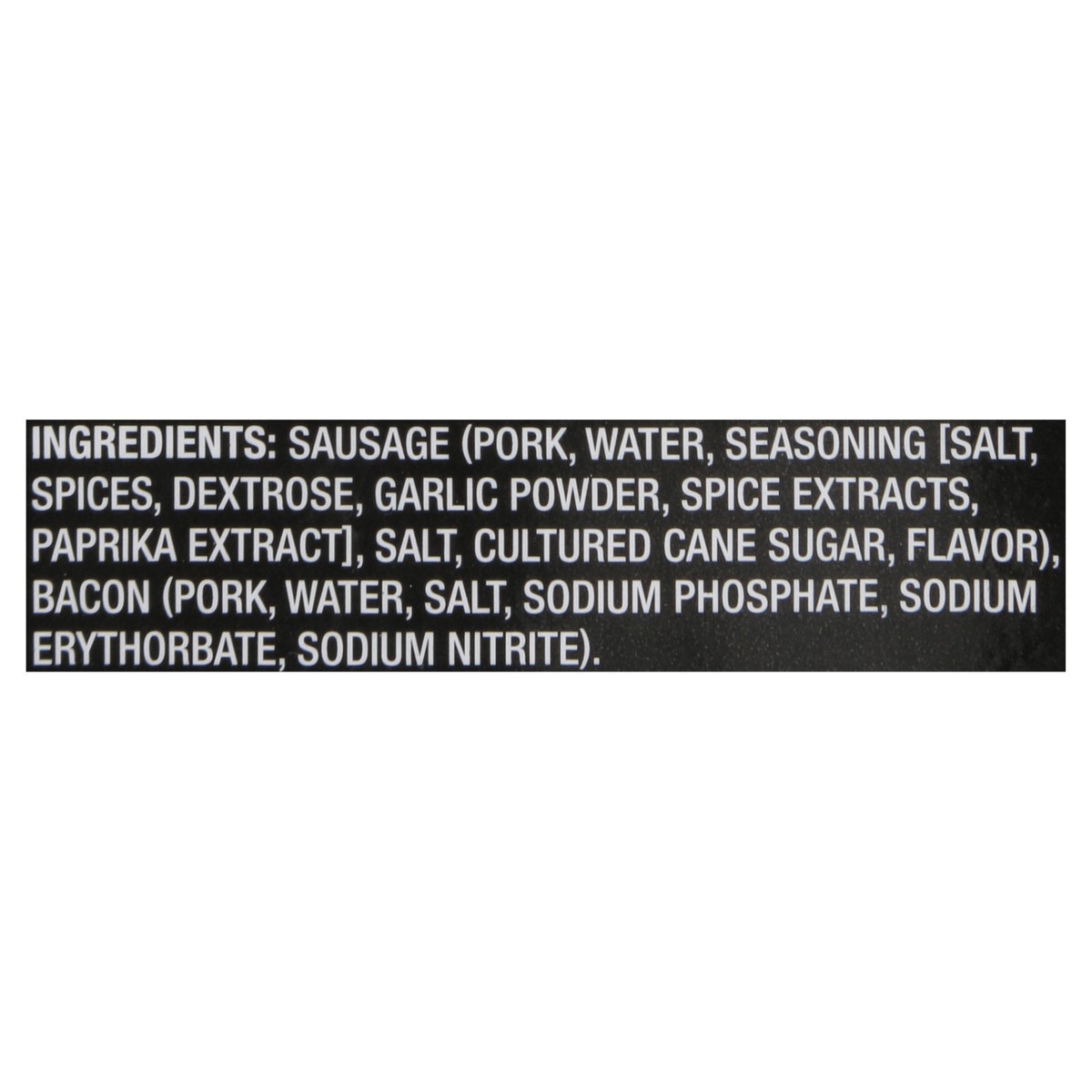 Sausage (Pork, Water, Seasoning [Salt, Spices, Dextrose, Garlic Powder, Spice Extracts, Paprika Extract], Salt, Cultured Cane Sugar, Flavor), Bacon (Pork, Water, Salt, Sodium Phosphate, Sodium Erythor…