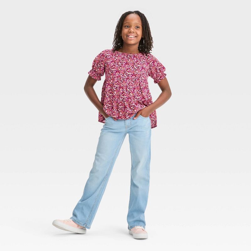 Girls' Mid-Rise Bootcut Jeans - Cat & Jack™ Light Wash 16: Adjustable Waistband, Stretch Denim