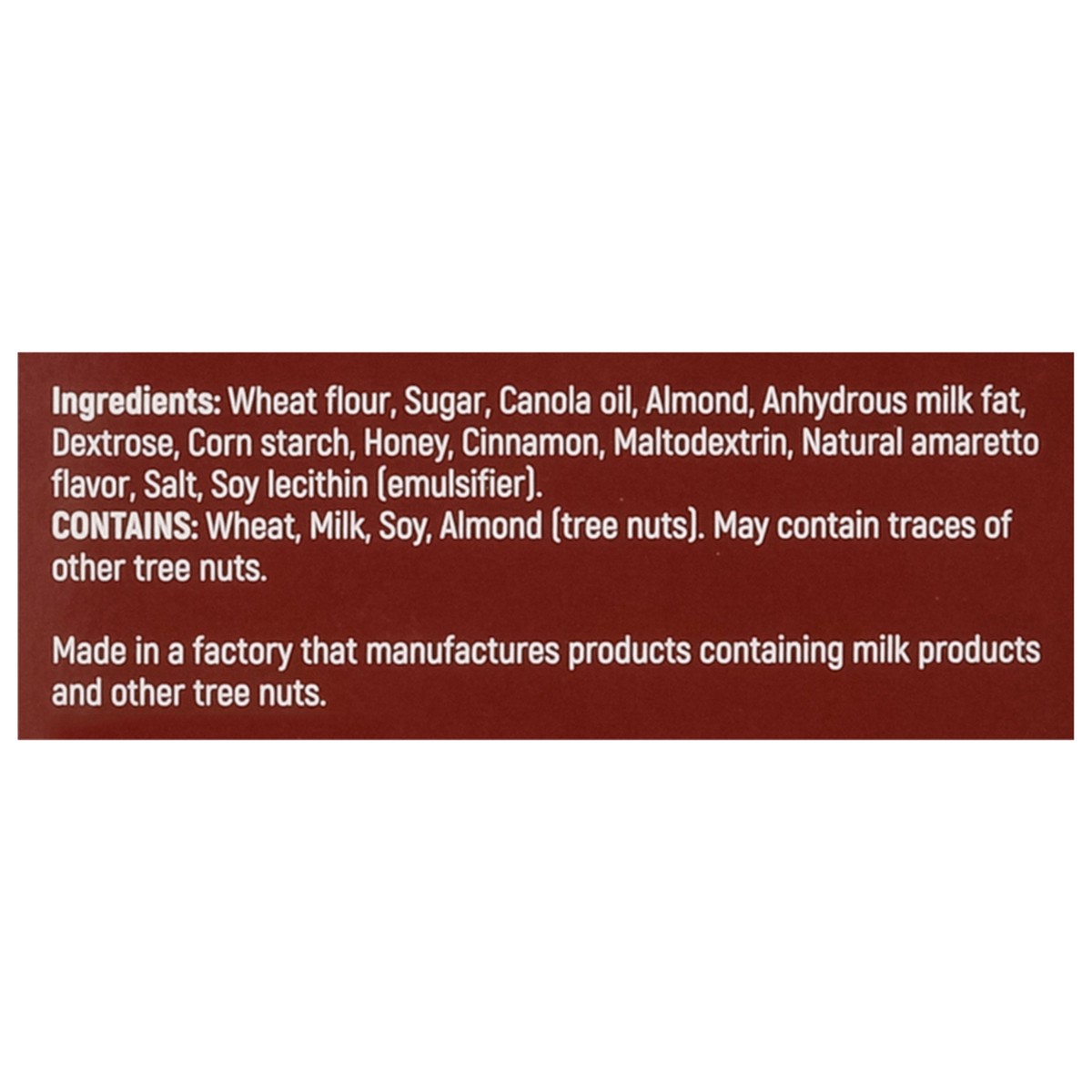 Wheat Flour, Sugar, Canola Oil, Almond, Anhydrous Milk Fat, Dextrose, Corn Starch, Honey, Cinnamon, Maltodextrin, Natural Amaretto Flavor, Salt, Soy Lecithin (Emulsifier).